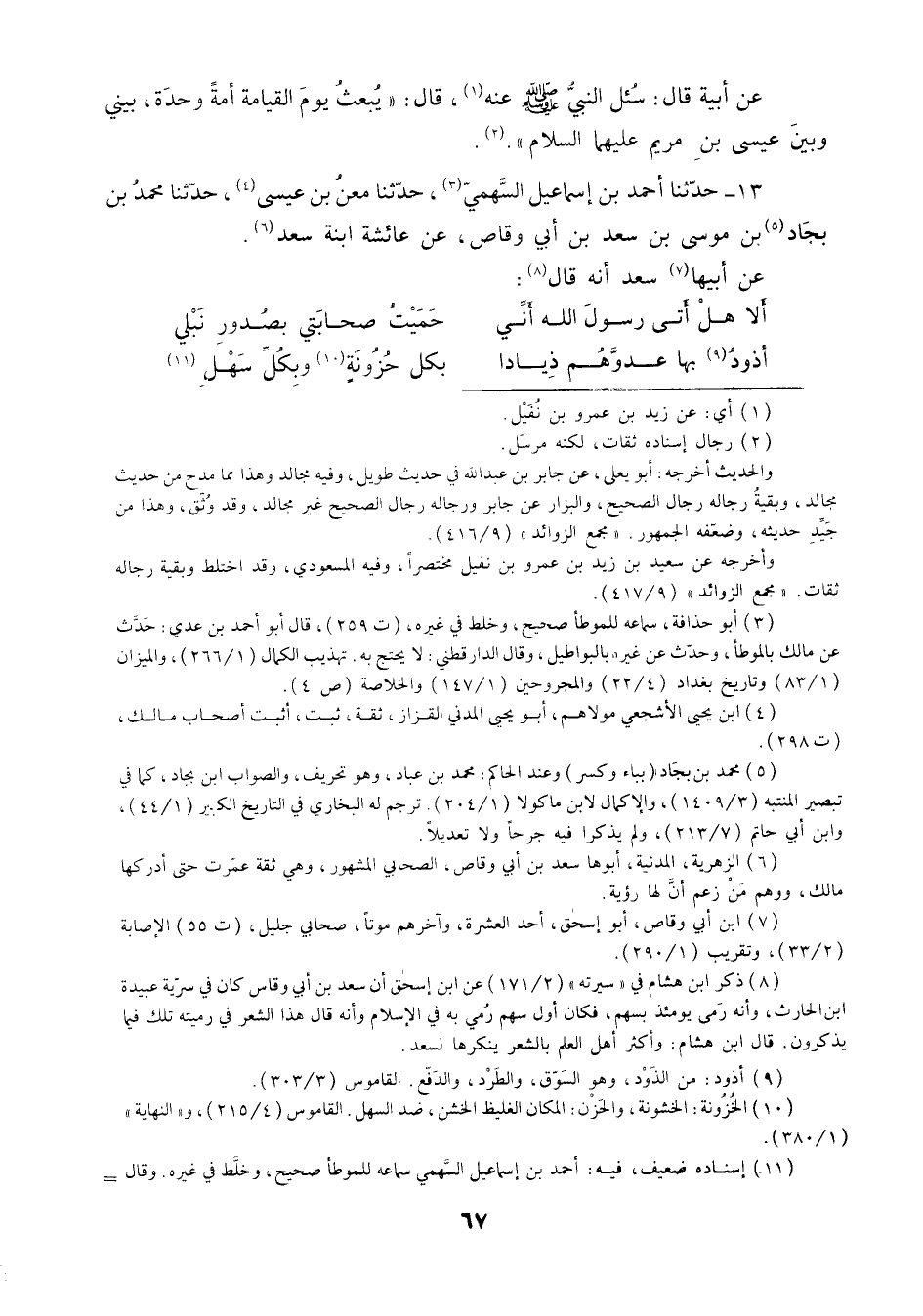 13 - حَدَّثَنَا أَحْمَدُ بْنُ إِسْمَاعِيلَ السَّهْمِيُّ، حَدَّثَنَا مَعْنُ بْنُ عِيسَى، حَدَّثَنَا مُحَمَّدُ بْنُ بِجَادِ بْنِ مُوسَى بْنِ سَعْدِ بْنِ أَبِي وَقَّاصٍ، عَنْ عَائِشَةَ ابْنَةِ سَعْدٍ، عَنْ أَبِيهَا سَعْدٍ أَنَّهُ قَالَ: «