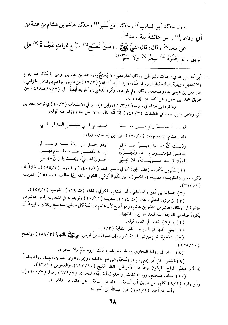 14 - حَدَّثَنَا أَبُو السَّائِبِ، حَدَّثَنَا ابْنُ نُمَيْرٍ، حَدَّثَنَا هَاشِمُ بْنُ هَاشِمِ بْنِ عُتْبَةَ بْنِ أَبِي وَقَّاصٍ، عَنْ عَائِشَةَ ابْنَةِ سَعْدٍ , عَنْ سَعْدٍ قَالَ: قَالَ النَّبِيُّ صَلَّى اللهُ عَلَيْهِ وَسَلَّمَ: «§مَنْ تَصَبَّحْ سَبْعَ تَمَرَاتٍ عَجْوَةً عَلَى الرِّيقِ لَمْ يَضُرَّهُ سِحْرٌ وَلَا سُمٌّ»
