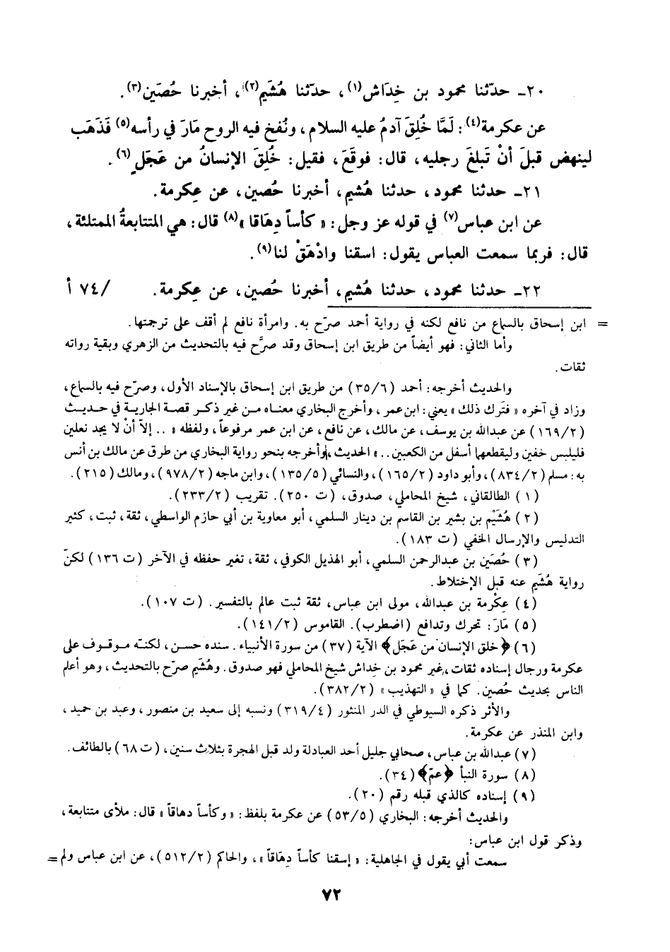 20 - حَدَّثَنَا مَحْمُودُ بْنُ خِدَاشٍ، حَدَّثَنَا هُشَيْمٌ، أَخْبَرَنَا حُصَيْنٌ، عَنْ عِكْرِمَةَ: " §لَمَّا خُلِقَ آدَمُ عَلَيْهِ السَّلَامُ , وَنُفِخَ فِيهِ الرُّوحُ مَارَ فِي رَأْسِهِ , فَذَهَبَ لِيَنْهَضَ قَبْلَ أَنْ تَبْلُغَ رِجْلَيْهِ قَالَ: فَوَقَعَ , فَقِيلَ: خُلِقَ الْإِنْسَانُ مِنْ عَجَلٍ "