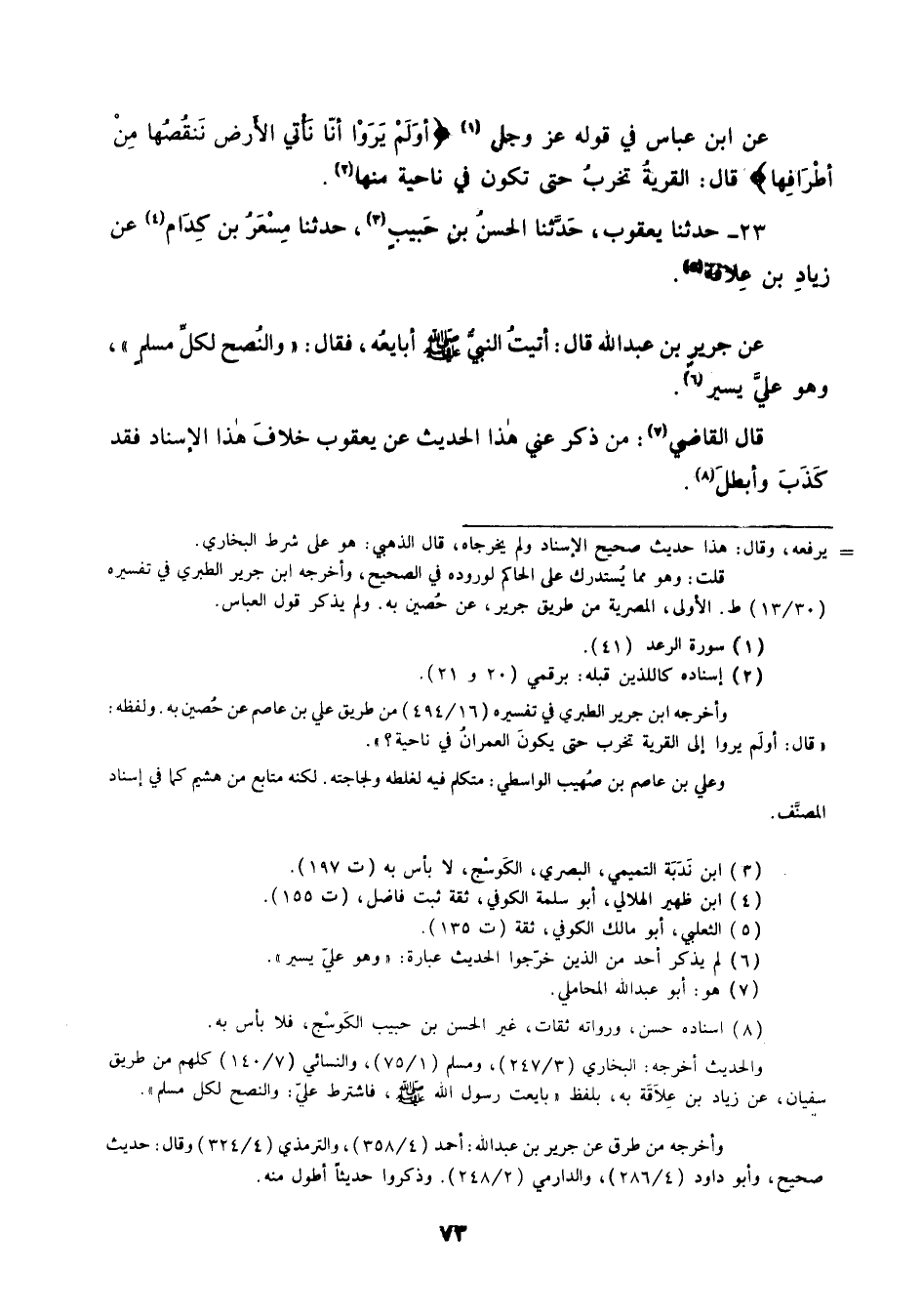 23 - حَدَّثَنَا يَعْقُوبُ، حَدَّثَنَا الْحَسَنُ بْنُ حَبِيبٍ، حَدَّثَنَا مِسْعَرُ بْنُ كِدَامٍ، عَنْ زِيَادِ بْنِ عِلَاقَةَ، عَنْ جَرِيرِ بْنِ عَبْدِ اللَّهِ قَالَ: أَتَيْتُ النَّبِيَّ صَلَّى اللهُ عَلَيْهِ وَسَلَّمَ أُبَايِعُهُ , فَقَالَ: «§وَالنُّصْحِ لِكُلِّ مُسْلِمٍ وَهُوَ عَلَيَّ يَسِيرٌ» قَالَ الْقَاضِي: مَنْ ذَكَرَ عَنِّي هَذَا الْحَدِيثَ عَنْ يَعْقُوبِ خِلَافُ هَذَا الْإِسْنَادِ فَقَدْ كَذَبَ وَأَبْطَلَ