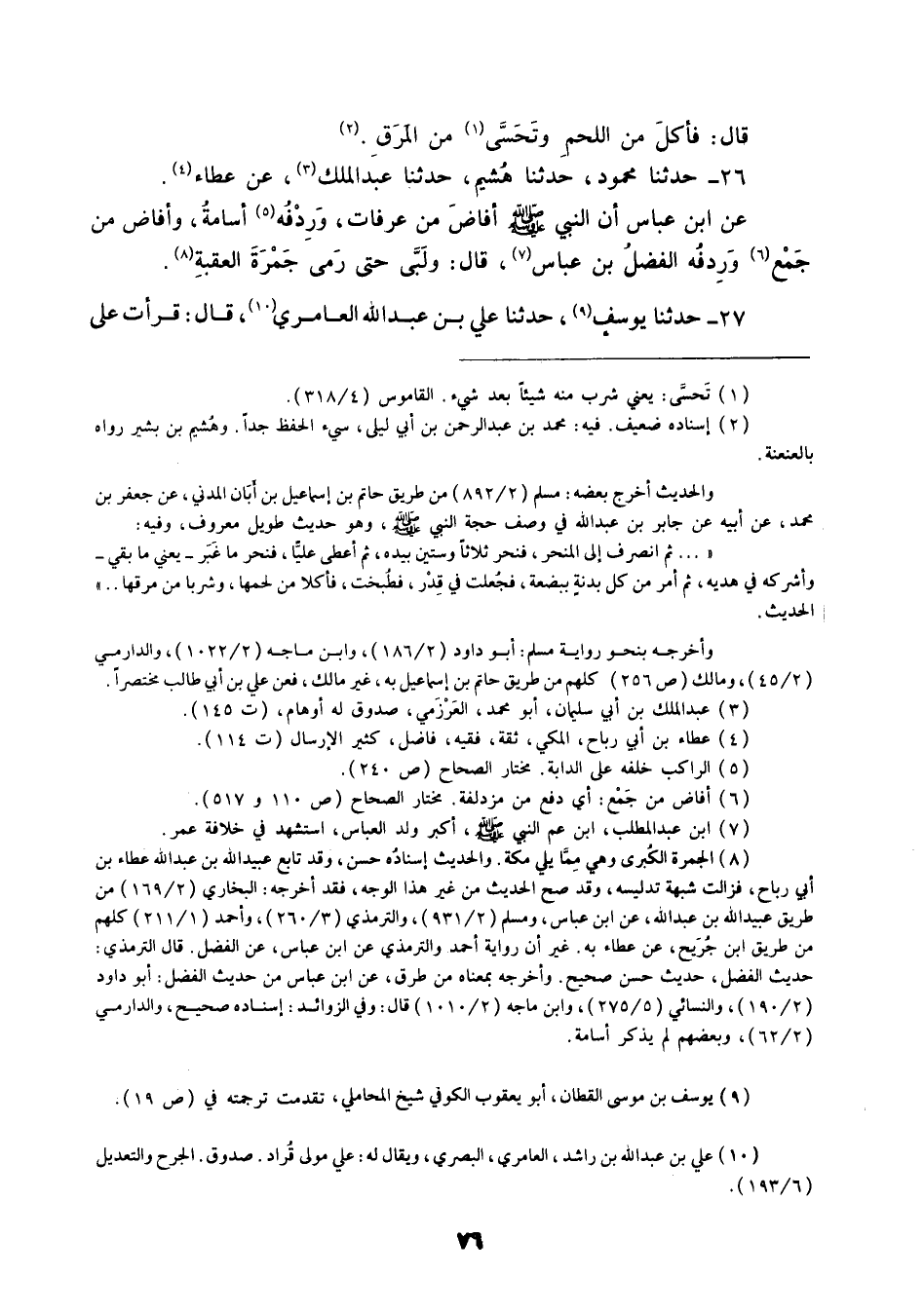 26 - حَدَّثَنَا مَحْمُودٌ، حَدَّثَنَا هُشَيْمٌ، حَدَّثَنَا عَبْدُ الْمَلِكِ، عَنْ عَطَاءٍ، عَنِ ابْنِ عَبَّاسٍ: " أَنَّ النَّبِيَّ صَلَّى اللهُ عَلَيْهِ وَسَلَّمَ §أَفَاضَ مِنْ عَرَفَاتٍ وَرِدْفُهُ أُسَامَةُ , وَأَفَاضَ مِنْ جَمْعٍ وَرِدْفُهُ الْفَضْلُ بْنُ عَبَّاسٍ قَالَ: وَلَبَّى حَتَّى رَمَى جَمْرَةَ الْعَقَبَةِ "
