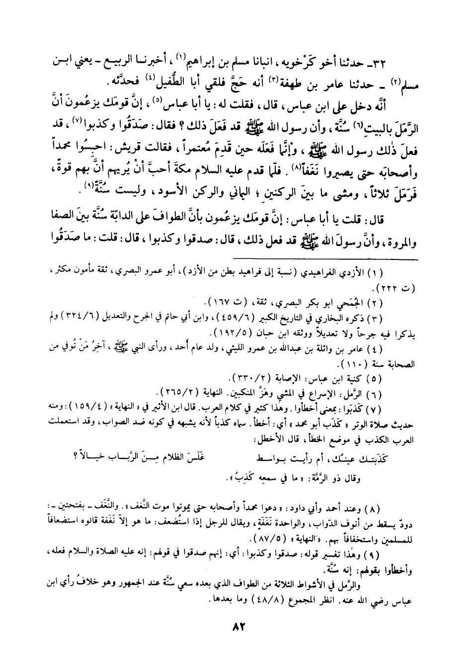 32 - حَدَّثَنَا أَخُو كَرْخَوَيْهِ , أَنْبَأَنَا مُسْلِمُ بْنُ إِبْرَاهِيمَ، أَخْبَرَنَا الرَّبِيعُ يَعْنِي ابْنَ مُسْلِمٍ، حَدَّثَنَا عَامِرُ بْنُ طِهْفَةَ، إِنَّهُ حَجَّ فَلَقِيَ أَبَا الطُّفَيْلِ فَحَدَّثَهُ أَنَّهُ دَخَلَ عَلَى ابْنِ عَبَّاسٍ قَالَ: فَقُلْتُ لَهُ يَا أَبَا عَبَّاسٍ , إِنَّ قَوْمَكَ، يَزْعُمُونَ أَنَّ الرَّمَلَ، بِالْبَيْتِ سُنَّةٌ , وَأَنَّ رَسُولَ اللَّهِ صَلَّى اللهُ عَلَيْهِ وَسَلَّمَ قَدْ فَعَلَ ذَلِكَ؟ فَقَالَ: صَدَقُوا وَكَذَبُوا، قَدْ «§فَعَلَ ذَلِكَ رَسُولُ اللَّهِ صَلَّى اللهُ عَلَيْهِ وَسَلَّمَ , وَإِنَّمَا فَعَلَهُ حِينَ قَدِمَ مُعْتَمِرًا» , فَقَالَتْ قُرَيْشٌ: احْبِسُوا مُحَمَّدًا وَأَصْحَابَهُ حَتَّى يَصِيرُوا نَغَفًا , فَلَمَّا قَدِمَ عَلَيْهِ السَّلَامُ مَكَّةَ أَحَبَّ أَنْ يُرِيَهُمْ أَنَّ بِهِمْ قُوَّةً , فَرَمَلَ ثَلَاثًا , وَمَشَى مَا بَيْنَ الرُّكْنَيْنِ الْيَمَانِي وَالرُّكْنِ الْأَسْوَدِ , وَلَيْسَتْ سُنَّةً قَالَ: قُلْتُ: يَا أَبَا عَبَّاسٍ , إِنَّ قَوْمَكَ يَزْعُمُونَ بِأَنَّ الطَّوَافَ عَلَى الدَّابَّةِ سُنَّةٌ بَيْنَ الصَّفَا وَالْمَرْوَةِ , وَأَنَّ رَسُولَ اللَّهِ صَلَّى اللهُ عَلَيْهِ وَسَلَّمَ قَدْ فَعَلَ ذَلِكَ؟ قَالَ: صَدَقُوا وَكَذَبُوا، قَالَ: قُلْتُ: مَا صَدَقُوا , -[83]- وَمَا كَذَبُوا؟ قَالَ: «فَعَلَهُ رَسُولُ اللَّهِ صَلَّى اللهُ عَلَيْهِ وَسَلَّمَ , وَإِنَّمَا فَعَلَهُ لِأَنَّهُ كَانَ لَا يُدَعُّ عِنْدَهُ أَحَدٌ» , وَلَيْسَتْ بِسُنَّةٍ قَالَ قُلْتُ: يَا أَبَا عَبَّاسٍ , إِنَّ قَوْمَكَ يَزْعُمُونَ أَنَّ السَّعْيَ فِي بَطْنِ الْوَادِي سُنَّةٌ وَأَنَّ رَسُولَ اللَّهِ صَلَّى اللهُ عَلَيْهِ وَسَلَّمَ قَدْ فَعَلَ ذَلِكَ، قَالَ: صَدَقُوا، قَالَ: قُلْتُ: مَا صَدَقُوا؟ قَالَ: إِنَّ جِبْرِيلَ عَلَيْهِ السَّلَامُ لَمَّا أَتَى إِبْرَاهِيَمَ عَلَيْهِ السَّلَامُ أَقَامَ لَهُ الْمَنَاسِكَ: طَافَ بِالْبَيْتِ , ثُمَّ خَرَجَ بِهِ إِلَى الصَّفَا , فَلَمَّا انْحَدَرَ إِبْرَاهِيَمُ عَرَضَ عَلَيْهِ الشَّيْطَانُ لِيَقْطَعَ طَوَافَهُ , فَسَعَى حَتَّى سَبَقَهُ فَعَلَ ذَلِكَ سَبْعَةَ أَشْوَاطٍ حَتَّى فَرَغَ مِنْ طَوَافِهِ , ثُمَّ خَرَجَ بِهِ إِلَى مِنًى , فَلَمَّا انْتَهَى بِهِ إِلَى الْعَقَبَةِ الْكُبْرَى تَخَيَّلَ لَهُ الشَّيْطَانُ هُنَاكَ , فَرَمَاهُ بِسَبْعِ حَصَيَاتٍ , فَسَاخَ فِي الْأَرْضِ , ثُمَّ انْتَهَى إِلَى الْجَمْرَةِ الْوُسْطَى فَتَخَيَّلَ لَهُ الشَّيْطَانُ , فَرَآهُ , فَرَمَاهُ بِسَبْعِ حَصَيَاتٍ , فَسَاخَ فِي الْأَرْضِ , ثُمَّ ذَهَبَ بِهِ إِلَى الْجَمْرَةِ الْقُصْوَى , فَتَخَيَّلَ لَهُ الشَّيْطَانُ , فَرَمَاهُ بِسَبْعِ حَصَيَاتٍ , فَسَاخَ فِي الْأَرْضِ , فَذَهَبَ , وَعِنْدَهَا تَلَّ ابْنَهُ لِلْجَبِينِ , ثُمَّ خَرَجَ بِهِ إِلَى جَمْعٍ , فَقَالَ: هَذَا مَبِيتُ النَّاسِ , وَمِنْ هَا هُنَا يُدْفَعُونَ , ثُمَّ ذَهَبَ إِلَى عَرَفَاتٍ , ثُمَّ قَالَ تَدْرِي لِمَ سُمِّيَتْ عَرَفَاتٍ؟ قَالَ: قُلْتُ: لَا، قَالَ: إِنَّ جِبْرِيلَ عَلَيْهِ السَّلَامُ لَمَّا وَقَفَ بِإِبْرَاهِيمَ عَلَيْهِ السَّلَامُ عَلَى عَرَفَاتٍ قَالَ لَهُ: هَلْ عَرَفْتَ؟ قَالَ: نَعَمْ , ثُمَّ قَالَ لَهُ: يَا أَبَا الطُّفَيْلِ , هَلْ تَدْرِي مِنْ أَيْنَ كَانَتِ التَّلْبِيَةُ؟ قَالَ: لَا، قَالَ: إِنَّ اللَّهَ جَلَّ وَعَزَّ أَوْحَى إِلَى إِبْرَاهِيَمَ عَلَيْهِ السَّلَامُ أَنْ أَذِّنْ فِي النَّاسِ بِالْحَجِّ , فَقَامَ إِبْرَاهِيَمُ صَلَّى اللهُ عَلَيْهِ وَسَلَّمَ , فَتَوَاضَعَتِ الْجِبَالُ وَارْتَفَعَتِ الْقُرَى , فَقَالَ إِبْرَاهِيَمُ عَلَيْهِ السَّلَامُ: أَيُّهَا النَّاسُ , إِنَّ رَبَّكُمْ عَزَّ وَجَلَّ يَدْعُوكُمْ , -[84]- فَأَجِيبُوهُ , فَأَقْبَلُوا , وَهُمْ يَقُولُونَ: لَبَّيْكَ , اللَّهُمَّ 