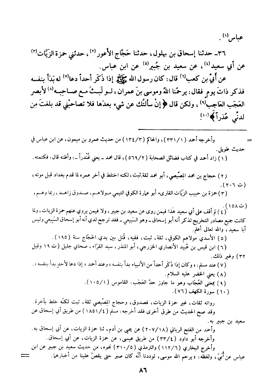 36 - حَدَّثَنَا إِسْحَاقُ بْنُ بُهْلُولٍ، حَدَّثَنَا حَجَّاجٌ الْأَعْوَرُ، حَدَّثَنِي حَمْزَةُ الزَّيَّاتُ، عَنْ أَبِي إِسْحَاقَ، عَنْ سَعِيدِ بْنِ جُبَيْرٍ، عَنِ ابْنِ عَبَّاسٍ، عَنْ أُبَيِّ بْنِ كَعْبٍ قَالَ: كَانَ رَسُولُ اللَّهِ صَلَّى اللهُ عَلَيْهِ وَسَلَّمَ إِذَا ذَكَرَ أَحَدًا دَعَا لَهُ بَدَأَ بِنَفْسِهِ , فَذَكَرَ ذَاتَ يَوْمٍ , فَقَالَ: " §يَرْحَمُنَا اللَّهُ , وَمُوسَى بْنَ عِمْرَانَ , لَوْ لَبِثَ مَعَ صَاحِبِهِ لَأَبْصَرُ الْعَجَبَ الْعَاجِبَ , وَلَكِنْ قَالَ: {إِنْ سَأَلْتُكَ عَنْ شَيْءٍ بَعْدَهَا فَلَا تُصَاحِبْنِي قَدْ بَلَغْتَ مِنْ لَدُنِّي عُذْرًا} [الكهف: 76] "