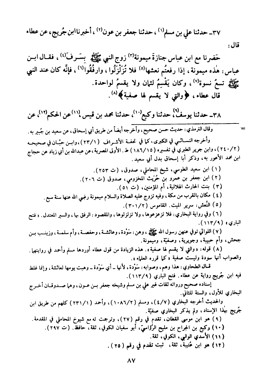 37 - حَدَّثَنَا عَلِيُّ بْنُ مُسْلِمٍ، حَدَّثَنَا جَعْفَرُ بْنُ عَوْنٍ، أَخْبَرَنَا ابْنُ جُرَيْجٍ، عَنْ عَطَاءٍ قَالَ: حَضَرْنَا مَعَ ابْنِ عَبَّاسٍ جِنَازَةَ مَيْمُونَةَ زَوْجِ النَّبِيِّ صَلَّى اللهُ عَلَيْهِ وَسَلَّمَ بِسَرِفَ، فَقَالَ ابْنُ عَبَّاسٍ: «§هَذِهِ مَيْمُونَةُ إِذَا رَفَعْتُمْ نَعْشَهَا , فَلَا تُزَلْزِلُوا , وَارْفُقُوا فَإِنَّهُ» كَانَ عِنْدَ النَّبِيِّ صَلَّى اللهُ عَلَيْهِ وَسَلَّمَ تِسْعُ نِسْوَةٍ , وَكَانَ يَقْسِمُ لِثَمَانٍ , وَلَا يَقْسِمُ لِوَاحِدَةٍ " قَالَ عَطَاءٌ: وَالَّتِي لَا يَقْسِمُ لَهَا صَفِيَّةُ