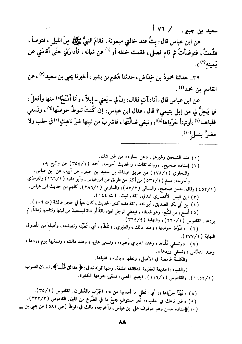 39 - حَدَّثَنَا مَحْمُودُ بْنُ خِدَاشٍ، حَدَّثَنَا هُشَيْمُ بْنُ بَشِيرٍ، أَخْبَرَنَا يَحْيَى بْنُ سَعِيدٍ، عَنِ الْقَاسِمِ بْنِ مُحَمَّدٍ، عَنِ ابْنِ عَبَّاسٍ قَالَ: أَتَاهُ آتٍ , فَقَالَ: إِنَّ لِيَ يَعْنِي إِبِلًا , وَأَنَا أَمْنَحُ مِنْهَا , وَأَفْعَلُ , فَمَا يَحِلُّ لِي مِنْ إِبِلِ يَتِيمِي قَالَ: فَقَالَ ابْنُ عَبَّاسٍ: «§إِنْ كُنْتَ تَلُوطُ حَوْضَهَا , وَتَسْقِي غَلْبَاهَا , وَتَهْنَأُ جَرْبَاهَا , وَتَبْغِي ضَالَّتَهَا فَاشْرَبْ مِنْ لَبَنِهَا غَيْرَ نَاهِكٍ فِي حَلْبٍ وَلَا مُضِرٍّ بِنَسْلٍ»