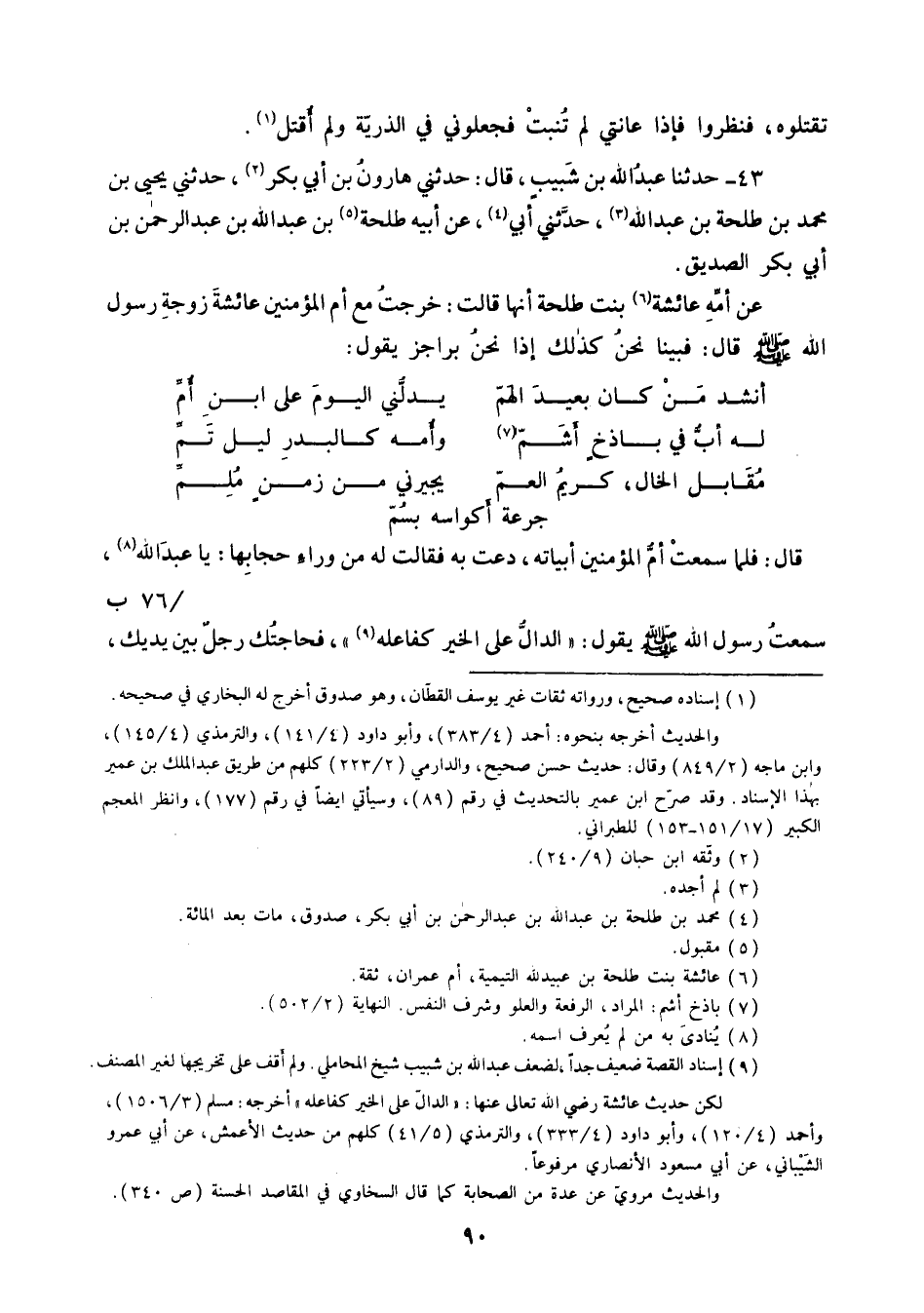 قَالَ: فَلَمَّا سَمِعَتْ أُمُّ الْمُؤْمِنِينَ أَبْيَاتِهِ دَعَتْ بِهِ , فَقَالَتْ لَهُ: مِنْ وَرَاءِ حِجَابِهَا: يَا عَبْدَ اللَّهِ , سَمِعْتُ رَسُولَ اللَّهِ صَلَّى اللهُ عَلَيْهِ وَسَلَّمَ يَقُولُ: «§الدَّالُّ عَلَى الْخَيْرِ كَفَاعِلِهِ» , فَحَاجَتُكَ رَجُلٌ بَيْنَ يَدَيْكَ -[91]- فَسَلْ عَنْ عَبْدِ اللَّهِ بْنِ الزُّبَيْرِ فَإِنَّهُ شَرَطُكَ , فَخَرَجَ الرَّجُلُ حَتَّى أَدْرَكَ عَبْدَ اللَّهِ بْنَ الزُّبَيْرِ , فَحَمَلَهُ عَلَى رَاحِلَةٍ , وَصَنَعَ إِلَيْهِ مَعْرُوفًا "