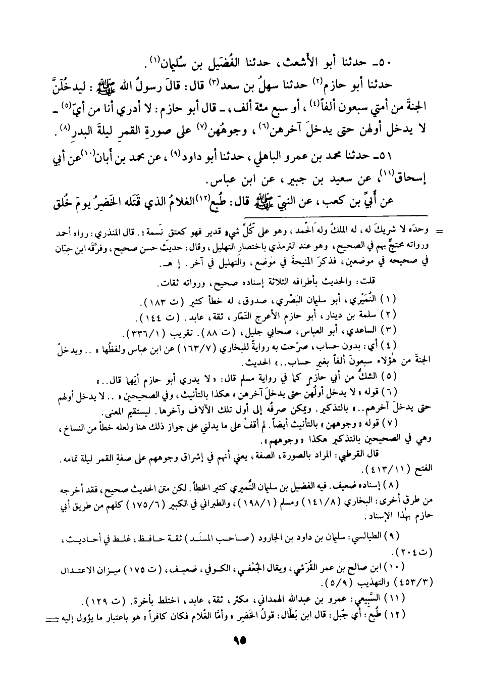 50 - حَدَّثَنَا أَبُو الْأَشْعَثِ، حَدَّثَنَا الْفُضَيْلُ بْنُ سُلَيْمَانَ، حَدَّثَنَا أَبُو حَازِمٍ، حَدَّثَنَا سَهْلُ بْنُ سَعْدٍ قَالَ: قَالَ رَسُولُ اللَّهِ صَلَّى اللهُ عَلَيْهِ وَسَلَّمَ: «§لَيَدْخُلَنَّ الْجَنَّةَ مِنْ أُمَّتِي سَبْعُونَ أَلْفًا أَوْ سَبْعُمِائَةِ أَلْفٍ» قَالَ أَبُو حَازِمٍ: لَا أَدْرِي أَنَا مِنْ أَيٍّ «لَا يَدْخُلُ أَوَّلُهُنَّ حَتَّى يَدْخُلَ آخِرَهُنَّ وُجُوهُهُنَّ عَلَى صُورَةِ الْقَمَرِ لَيْلَةَ الْبَدْرِ»