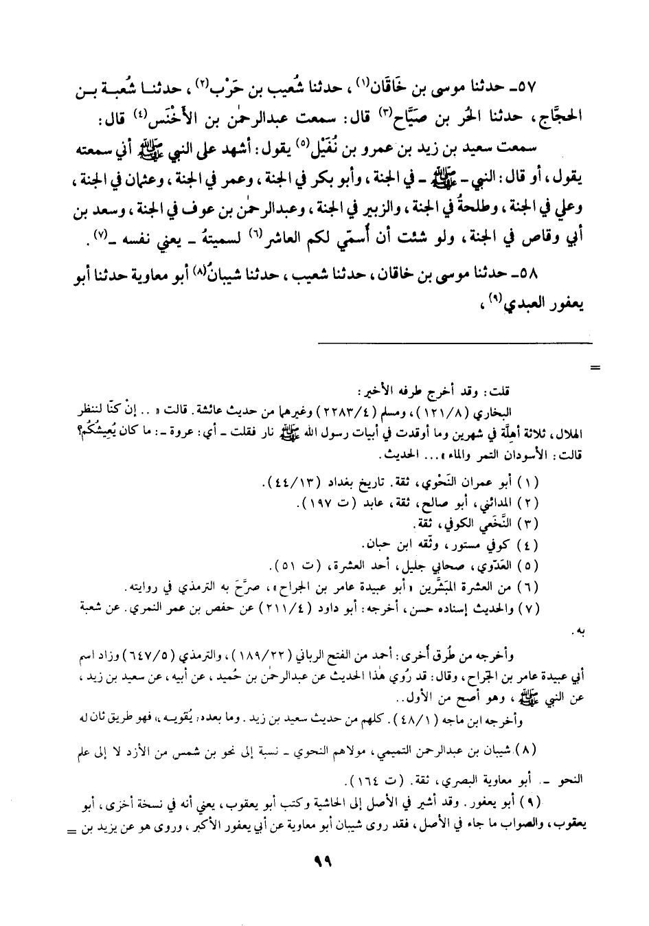 57 - حَدَّثَنَا مُوسَى بْنُ خَاقَانَ، حَدَّثَنَا شُعَيْبُ بْنُ حَرْبٍ، حَدَّثَنَا شُعْبَةُ بْنُ الْحَجَّاجِ، حَدَّثَنَا الْحُرُّ بْنُ صِيَاحٍ قَالَ: سَمِعْتُ عَبْدَ الرَّحْمَنِ بْنَ الْأَخْنَسِ قَالَ: سَمِعْتُ سَعِيدَ بْنَ زَيْدِ بْنِ عَمْرِو بْنِ نُفَيْلٍ يَقُولُ: " §أَشْهَدُ عَلَى النَّبِيِّ صَلَّى اللهُ عَلَيْهِ وَسَلَّمَ: أَنِّي سَمِعْتُهُ يَقُولُ: أَوْ قَالَ النَّبِيُّ صَلَّى اللهُ عَلَيْهِ وَسَلَّمَ فِي الْجَنَّةِ , وَأَبُو بَكْرٍ فِي الْجَنَّةِ , وَعُمَرُ فِي الْجَنَّةِ , وَعُثْمَانُ فِي الْجَنَّةِ , وَعَلِيٌّ فِي الْجَنَّةِ , وَطَلْحَةُ فِي الْجَنَّةِ , وَالزُّبَيْرُ فِي الْجَنَّةِ , وَعَبْدُ الرَّحْمَنِ بْنُ عَوْفٍ فِي الْجَنَّةِ , وَسَعْدُ بْنُ أَبِي وَقَّاصٍ فِي الْجَنَّةِ «, وَلَوْ شِئْتُ أَنْ أَسَمِيَ لَكُمُ الْعَاشِرَ لَسَمَّيْتُهُ يَعْنِي نَفْسَهُ».