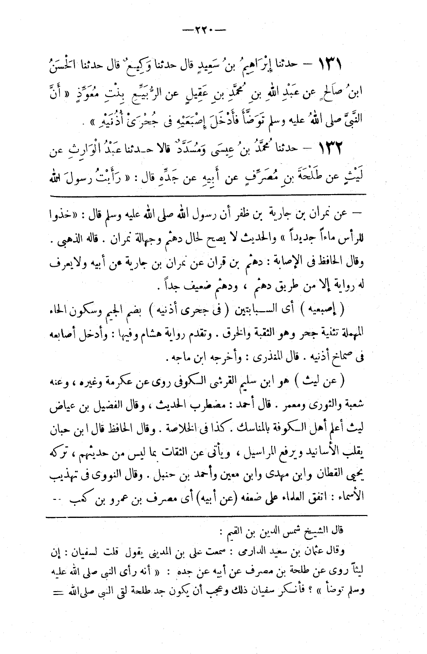 قال الشيخ شمس الدين بن القيم وقال عثمان ين سعيد الدارمي سمعت علي بن المديني يقول قلت لسفيان إن ليثا روى عن طلحة بن مصرف عن أبيه عن جده أنه رأى النبي صلى الله عليه و سلم توضأ فأنكر سفيان ذلك وعجب أن يكون جد طلحة لقي النبي صلى الله