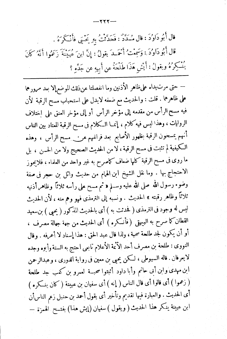 قُلْت : وَالْحَدِيث مَعَ ضَعْفه لَا يَدُلّ عَلَى اِسْتِحْبَاب مَسْح الرَّقَبَة لِأَنَّ فِيهِ مَسْح الرَّأْس مِنْ مُقَدَّمه إِلَى مُؤَخَّر الرَّأْس أَوْ إِلَى مُؤَخَّر الْعُنُق عَلَى اِخْتِلَاف الرِّوَايَات ، وَهَذَا لَيْسَ فِيهِ كَلَام ، إِنَّمَا الْكَلَام فِي مَسْح الرَّقَبَة الْمُعْتَاد بَيْن النَّاس أَنَّهُمْ يَمْسَحُونَ الرَّقَبَة بِظُهُورِ الْأَصَابِع بَعْد فَرَاغهمْ عَنْ مَسْح الرَّأْس ، وَهَذِهِ الْكَيْفِيَّة لَمْ تَثْبُت فِي مَسْح الرَّقَبَة ، لَا مِنْ الْحَدِيث الصَّحِيح وَلَا مِنْ الْحَسَن ، بَلْ مَا رُوِيَ فِي مَسْح الرَّقَبَة كُلّهَا ضِعَاف كَمَا صَرَّحَ بِهِ غَيْر وَاحِد مِنْ الْعُلَمَاء ، فَلَا يَجُوز الِاحْتِجَاج بِهَا .