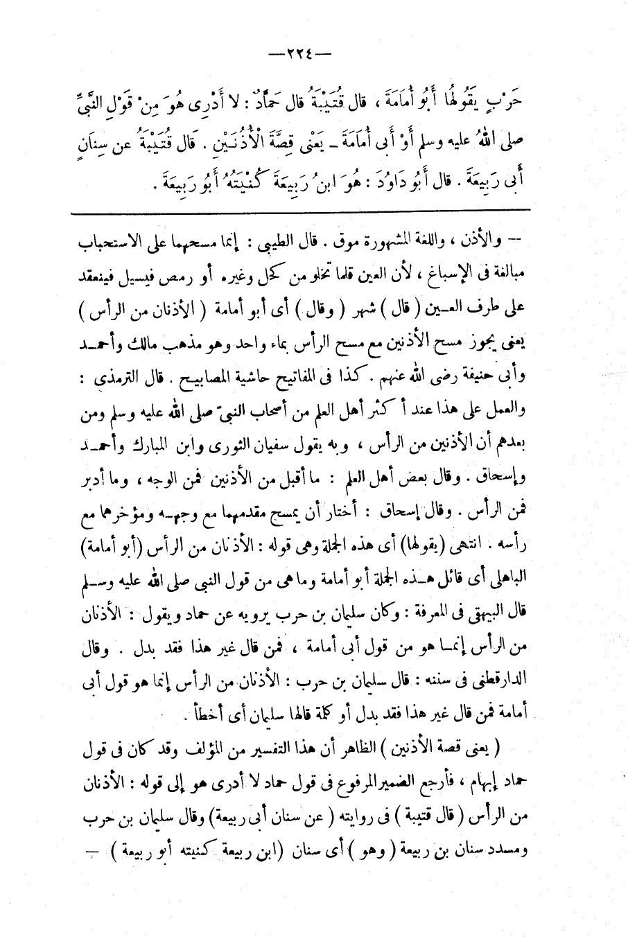 وَقَالَ الدَّارَقُطْنِيُّ فِي سُنَنه : قَالَ سُلَيْمَان بْن حَرْب : الْأُذُنَانِ مِنْ الرَّأْس إِنَّمَا هُوَ قَوْل أَبِي أُمَامَة فَمَنْ قَالَ غَيْر هَذَا فَقَدْ بَدَّلَ أَوْ كَلِمَة قَالَهَا سُلَيْمَان أَيْ أَخْطَأَ .