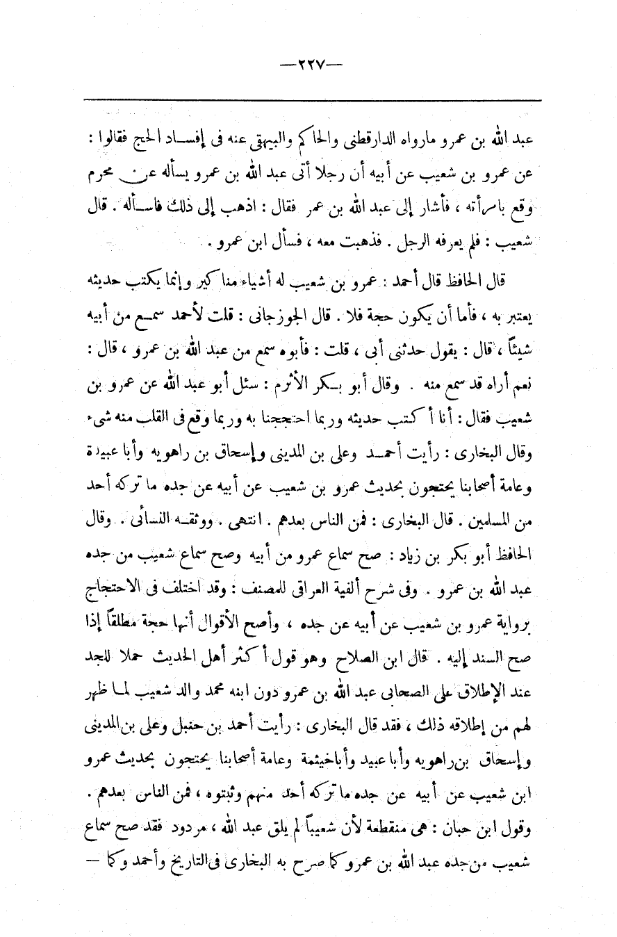قَالَ اِبْن الصَّلَاح وَهُوَ قَوْل أَكْثَرِ أَهْل الْحَدِيث حَمْلًا لِلْجَدِّ عِنْد الْإِطْلَاق عَلَى الصَّحَابِيّ عَبْد اللَّه بْن عَمْرو دُون اِبْنه مُحَمَّد وَالِد شُعَيْب لِمَا ظَهَرَ لَهُمْ مِنْ إِطْلَاقه ذَلِكَ ، فَقَدْ قَالَ الْبُخَارِيّ : رَأَيْت أَحْمَد بْن حَنْبَل وَعَلِيّ بْن الْمَدِينِيّ وَإِسْحَاق بْن رَاهْوَيْهِ وَأَبَا عُبَيْدَةَ وَأَبَا خَيْثَمَةَ وَعَامَّة أَصْحَابنَا يَحْتَجُّونَ بِحَدِيثِ عَمْرو بْن شُعَيْب عَنْ أَبِيهِ عَنْ جَدّه مَا تَرَكَهُ أَحَد مِنْهُمْ وَثَبَتُوهُ ، فَمَنْ النَّاسُ بَعْدهمْ .