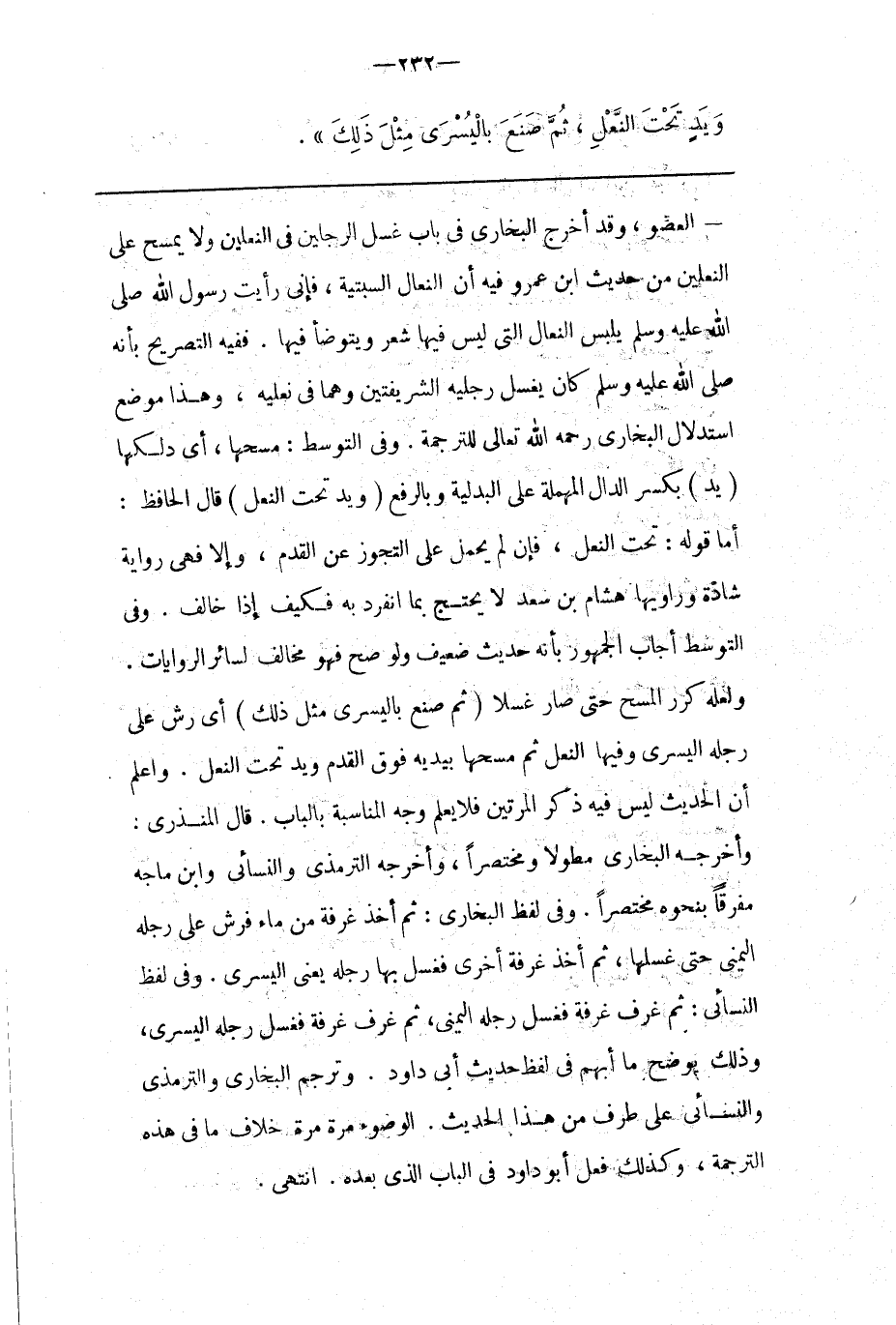الْعُضْو ، وَقَدْ أَخْرَجَ الْبُخَارِيّ فِي بَاب غَسْل الرِّجْلَيْنِ فِي النَّعْلَيْنِ وَلَا يَمْسَح عَلَى النَّعْلَيْنِ مِنْ حَدِيث اِبْن عَمْرو فِيهِ أَنَّ النِّعَالَ السِّبْتِيَّةُ ، فَإِنِّي رَأَيْت رَسُول اللَّه صَلَّى اللَّه عَلَيْهِ وَسَلَّمَ يَلْبَس النِّعَال الَّتِي لَيْسَ فِيهَا شَعْر وَيَتَوَضَّأ فِيهَا .