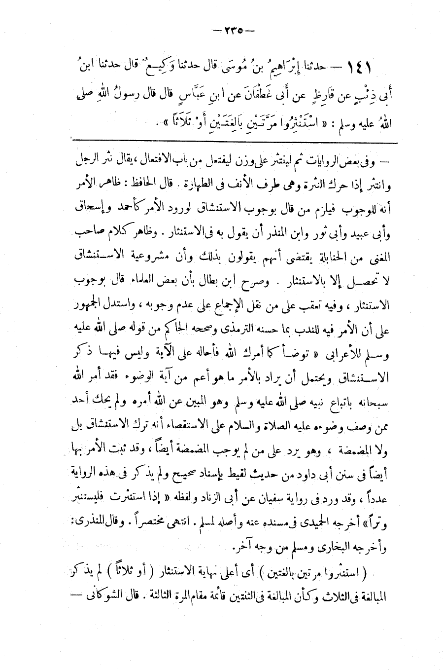 وَصَرَّحَ اِبْن بَطَّال بِأَنَّ بَعْض الْعُلَمَاء قَالَ بِوُجُوبِ الِاسْتِنْثَار ، وَفِيهِ تَعَقُّبٌ عَلَى مَنْ نَقَلَ الْإِجْمَاع عَلَى عَدَم وُجُوبه ، وَاسْتَدَلَّ الْجُمْهُور عَلَى أَنَّ الْأَمْر فِيهِ لِلنَّدْبِ بِمَا حَسَّنَهُ التِّرْمِذِيّ وَصَحَّحَهُ الْحَاكِم مِنْ قَوْله صَلَّى اللَّه عَلَيْهِ وَسَلَّمَ لِلْأَعْرَابِيِّ " تَوَضَّأْ كَمَا أَمَرَك اللَّه " فَأَحَالَهُ عَلَى الْآيَة وَلَيْسَ فِيهَا ذِكْرُ الِاسْتِنْشَاق وَيَحْتَمِل أَنْ يُرَاد بِالْأَمْرِ مَا هُوَ أَعَمُّ مِنْ آيَة الْوُضُوء فَقَدْ أَمَرَ اللَّه سُبْحَانه بِاتِّبَاعِ نَبِيّه صَلَّى اللَّه عَلَيْهِ وَسَلَّمَ وَهُوَ الْمُبَيِّنُ عَنْ اللَّهِ أَمْرَهُ وَلَمْ يَحْكِ أَحَد مِمَّنْ وَصَفَ وُضُوءَهُ - عَلَيْهِ الصَّلَاة وَالسَّلَام - عَلَى الِاسْتِقْصَاء أَنَّهُ تَرَكَ الِاسْتِنْشَاق بَلْ وَلَا الْمَضْمَضَة وَهُوَ يَرُدّ عَلَى مَنْ لَمْ يُوجِب الْمَضْمَضَة أَيْضًا " ، وَقَدْ ثَبَتَ الْأَمْر بِهَا أَيْضًا فِي سُنَن أَبِي دَاوُدَ مِنْ حَدِيث لَقِيط بِإِسْنَادٍ صَحِيح وَلَمْ يَذْكُر فِي هَذِهِ الرِّوَايَة عَدَدًا ، وَقَدْ وَرَدَ فِي رِوَايَة سُفْيَان عَنْ أَبِي الزِّنَاد وَلَفْظه " إِذَا اِسْتَنْثَرْت فَلْتَسْتَنْثِرْ وِتْرًا " أَخْرَجَهُ الْحُمَيْدِيّ فِي مُسْنَده عَنْهُ وَأَصْله لِمُسْلِمٍ .