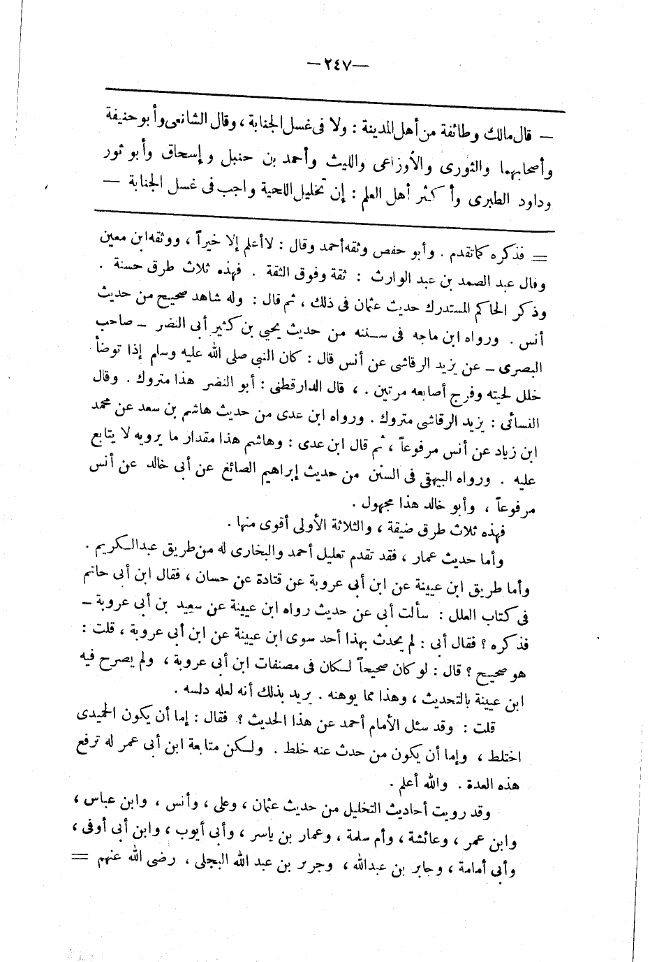 وقد رويت أحاديث التخليل من حديث عثمان وعلي وأنس وابن عباس وابن عمر وعائشة وأم سلمة وعمار بن ياسر وأبي أيوب وابن أبي أوفى وأبي أمامة وجابر بن عبد الله وجرير بن عبد الله البجلي رضي الله عنهم
