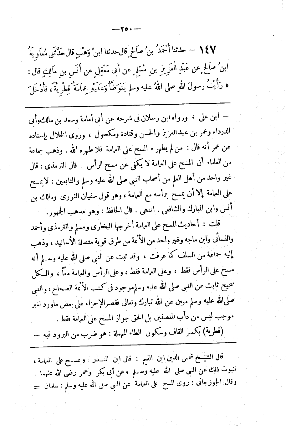 قال الشيخ شمس الدين ابن القيم قال ابن المدر ويمسح على العمامة لثبوت ذلك عن النبي صلى الله عليه و سلم وعن أبي بكر وعمر رضي الله عنهما