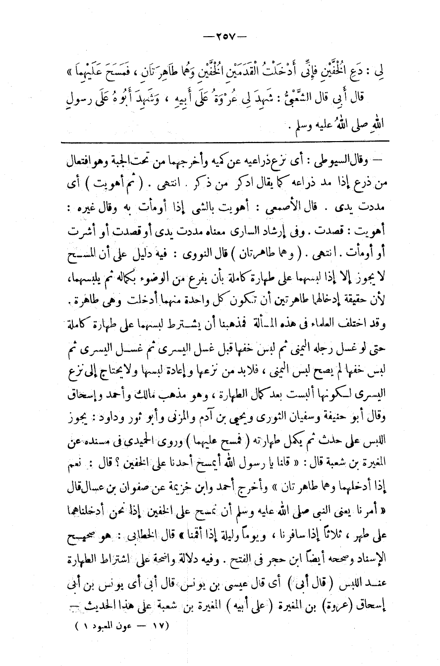 : وَرَوَى الْحُمَيْدِيّ فِي مُسْنَده عَنْ الْمُغِيرَة بْن شُعْبَة قَالَ : " قُلْنَا يَا رَسُول اللَّه أَيَمْسَحُ أَحَدنَا عَلَى الْخُفَّيْنِ ؟ قَالَ : نَعَمْ إِذَا أَدْخَلَهُمَا وَهُمَا طَاهِرَتَانِ " وَأَخْرَجَ أَحْمَد وَابْن خُزَيْمَةَ عَنْ صَفْوَان بْن عَسَّال قَالَ " أَمَرَنَا يَعْنِي النَّبِيّ صَلَّى اللَّه عَلَيْهِ وَسَلَّمَ أَنْ نَمْسَح عَلَى الْخُفَّيْنِ إِذَا نَحْنُ أَدْخَلْنَاهُمَا عَلَى طُهْر ، ثَلَاثًا إِذَا سَافَرْنَا ، وَيَوْمًا وَلَيْلَة إِذَا أَقَمْنَا " قَالَ الْخَطَّابِيُّ : هُوَ صَحِيح الْإِسْنَاد وَصَحَّحَهُ أَيْضًا اِبْن حَجَر فِي الْفَتْح . وَفِيهِ دَلَالَة وَاضِحَة عَلَى اِشْتِرَاط الطَّهَارَة عِنْد اللُّبْس