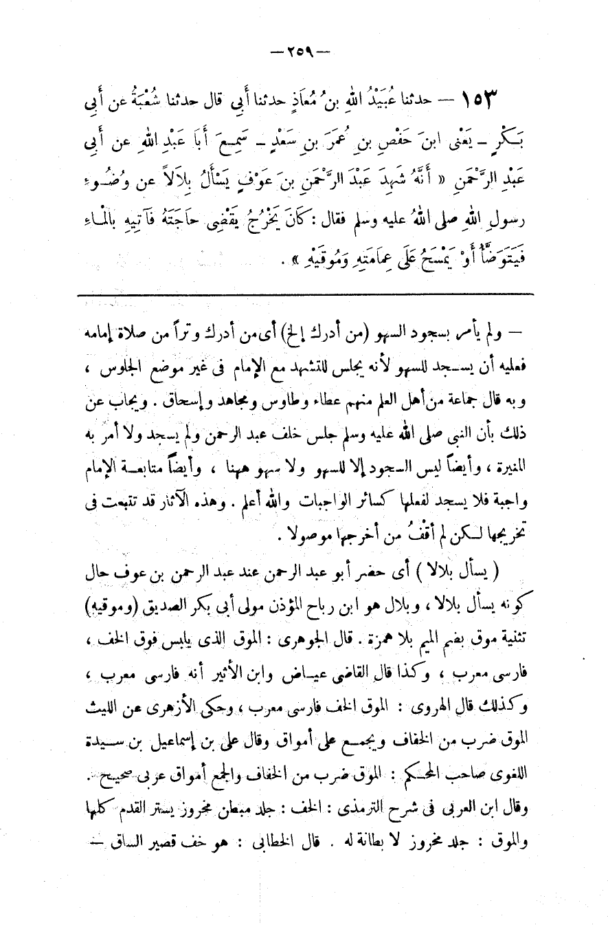 وَلَمْ يَأْمُر بِسُجُودِ السَّهْو ( مَنْ أَدْرَكَ إِلَخْ ) : أَيْ مَنْ أَدْرَكَ وِتْرًا مِنْ صَلَاة إِمَامه فِعْلَيْهِ أَنْ يَسْجُد لِلسَّهْوِ لِأَنَّهُ يَجْلِس لِلتَّشَهُّدِ مَعَ الْإِمَام فِي غَيْر مَوْضِع الْجُلُوس ، وَبِهِ قَالَ جَمَاعَة مِنْ أَهْل الْعِلْم مِنْهُمْ عَطَاء وَطَاوُسٌ وَمُجَاهِد وَإِسْحَاق . وَيُجَاب عَنْ ذَلِكَ بِأَنَّ النَّبِيّ صَلَّى اللَّه عَلَيْهِ وَسَلَّمَ جَلَسَ خَلْف عَبْد الرَّحْمَن وَلَمْ يَسْجُد وَلَا أَمَرَ بِهِ الْمُغِيرَة ، وَأَيْضًا لَيْسَ السُّجُود إِلَّا لِلسَّهْوِ وَلَا سَهْو هَاهُنَا ، وَأَيْضًا مُتَابَعَة الْإِمَام وَاجِبَة فَلَا يَسْجُد لِفِعْلِهَا كَسَائِرِ الْوَاجِبَات وَاَللَّه أَعْلَمُ . وَهَذِهِ الْآثَار قَدْ تَتَبَّعْتُ فِي تَخْرِيجهَا لَكِنْ لَمْ أَقْفُ مَنْ أَخْرَجَهَا مَوْصُولًا .
