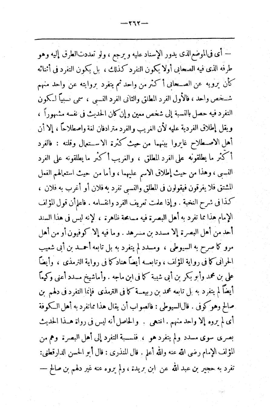 أَيْ فِي الْمَوْضِع الَّذِي يَدُور الْإِسْنَاد عَلَيْهِ وَيَرْجِع ، وَلَوْ تَعَدَّدَتْ الطُّرُق إِلَيْهِ وَهُوَ طَرَفه الَّذِي فِيهِ الصَّحَابِيّ أَوَّلًا يَكُون التَّفَرُّد كَذَلِكَ ، بَلْ يَكُون التَّفَرُّد فِي أَثْنَائِهِ كَأَنْ يَرْوِيه عَنْ الصَّحَابِيّ أَكْثَرُ مِنْ وَاحِد ثُمَّ يَتَفَرَّد بِرِوَايَتِهِ عَنْ وَاحِد مِنْهُمْ شَخْص وَاحِد ، فَالْأَوَّل الْفَرْد الْمُطْلَق وَالثَّانِي الْفَرْد النِّسْبِيّ ، سُمِّيَ نِسْبِيًّا لِكَوْنِ التَّفَرُّد فِيهِ حَصَلَ بِالنِّسْبَةِ إِلَى شَخْص مُعَيَّن وَإِنْ كَانَ الْحَدِيث فِي نَفْسه مَشْهُورًا ، وَيَقُلْ إِطْلَاق الْفَرْدِيَّة عَلَيْهِ لِأَنَّ الْغَرِيب وَالْفَرْد مُتَرَادِفَانِ لُغَة وَاصْطِلَاحًا ، إِلَّا أَنَّ أَهْل الِاصْطِلَاح غَايَرُوا بَيْنهمَا مِنْ حَيْثُ كَثْرَة الِاسْتِعْمَال وَقُلْته : فَالْفَرْد أَكْثَرَ مَا يُطْلِقُونَهُ عَلَى الْفَرْد الْمُطْلَق ، وَالْغَرِيب أَكْثَرَ مَا يُطْلِقُونَهُ عَلَى الْفَرْد النِّسْبِيّ ، وَهَذَا مِنْ حَيْثُ إِطْلَاق الِاسْم عَلَيْهِمَا ، وَأَمَّا مِنْ حَيْثُ اِسْتِعْمَالهمْ الْفِعْلَ الْمُشْتَقّ فَلَا يُفَرِّقُونَ فَيَقُولُونَ فِي الْمُطْلَق وَالنِّسْبِيّ تَفَرَّدَ بِهِ فُلَان أَوْ أَغْرَبَ بِهِ فُلَان ، كَذَا فِي شَرْح النُّخْبَة . وَإِذَا عَلِمْت تَعْرِيف الْفَرْد وَانْقِسَامه . فَاعْلَمْ أَنَّ قَوْل الْمُؤَلِّف الْإِمَام هَذَا مِمَّا تَفَرَّدَ بِهِ أَهْل الْبَصْرَة فِيهِ مُسَامَحَة ظَاهِرَة ، لِإِنَّهُ لَيْسَ فِي هَذَا السَّنَد أَحَد مِنْ أَهْل الْبَصْرَة إِلَّا مُسَدَّد بْن مُسَرْهَد . وَمَا فِيهِ إِلَّا كُوفِيُّونَ أَوْ مِنْ أَهْل مَرْو كَمَا صَرَّحَ بِهِ السُّيُوطِيُّ ، وَمُسَدَّد لَمْ يَتَفَرَّد بِهِ بَلْ تَابَعَهُ أَحْمَد بْن أَبِي شُعَيْب الْحَرَّانِيّ كَمَا فِي رِوَايَة الْمُؤَلِّف ، وَتَابَعَهُ أَيْضًا هَنَّاد كَمَا فِي رِوَايَة التِّرْمِذِيّ ، وَأَيْضًا عَلِيّ بْن مُحَمَّد وَأَبُو بَكْر بْن أَبِي شَيْبَة كَمَا فِي ابْن مَاجَهْ . وَأَمَّا شَيْخ مُسَدَّد أَعْنِي وَكِيعًا أَيْضًا لَمْ يَتَفَرَّد بِهِ بَلْ تَابَعَهُ مُحَمَّد بْن رَبِيعَة كَمَا فِي التِّرْمِذِيّ فَإِنَّمَا التَّفَرُّد فِي دَلْهَم بْن صَالِح وَهُوَ كُوفِيّ . قَالَ السُّيُوطِيُّ : فَالصَّوَاب أَنْ يُقَال هَذَا مِمَّا تَفَرَّدَ بِهِ أَهْل الْكُوفَة أَيْ لَمْ يَرْوِهِ إِلَّا وَاحِد مِنْهُمْ . اِنْتَهَى . وَالْحَاصِل أَنَّهُ لَيْسَ فِي رُوَاة هَذَا الْحَدِيث بَصْرِيّ سِوَى مُسَدَّد وَلَمْ يَتَفَرَّد هُوَ ، فَنِسْبَة التَّفَرُّد إِلَى أَهْل الْبَصْرَة وَهْم مِنْ الْمُؤَلِّف الْإِمَام رَضِيَ اللَّه عَنْهُ . وَاَللَّه أَعْلَمُ . قَالَ الْمُنْذِرِيُّ : قَالَ أَبُو الْحَسَن الدَّارَقُطْنِيُّ : تَفَرَّدَ بِهِ حُجَيْر بْن عَبْد اللَّه عَنْ اِبْن بُرَيْدَةَ ، وَلَمْ يَرْوِهِ عَنْهُ غَيْر دَلْهَم بْن صَالِح @