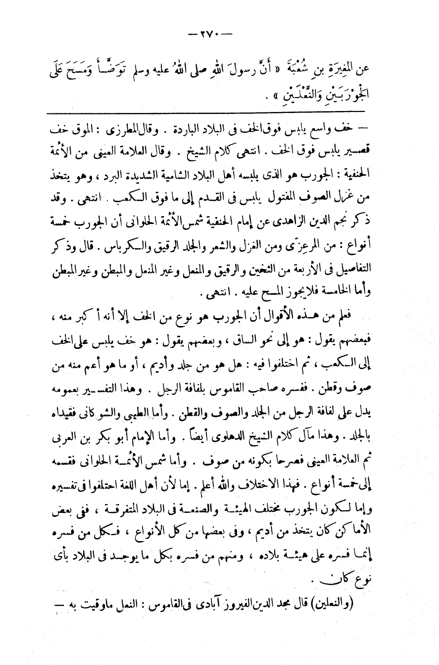 فَعُلِمَ مِنْ هَذِهِ الْأَقْوَال أَنَّ الْجَوْرَب هُوَ نَوْع مِنْ الْخُفّ إِلَّا أَنَّهُ أَكْبَرُ مِنْهُ ، فَبَعْضهمْ يَقُول : هُوَ إِلَى نَحْو السَّاق ، وَبَعْضهمْ يَقُول : هُوَ خُفّ يُلْبَس عَلَى الْخُفّ إِلَى الْكَعْب ، ثُمَّ اِخْتَلَفُوا فِيهِ : هَلْ هُوَ مِنْ جِلْد وَأَدِيم ، أَوْ مَا هُوَ أَعَمُّ مِنْهُ مِنْ صُوف وَقُطْن . فَفَسَّرَهُ صَاحِب الْقَامُوس بِلِفَافَةِ الرِّجْل . وَهَذَا التَّفْسِير بِعُمُومِهِ يَدُلّ عَلَى لِفَافَة الرِّجْل مِنْ الْجِلْد وَالصُّوف وَالْقُطْن . وَأَمَّا الطِّيبِيُّ وَالشَّوْكَانِيّ فَقَيَّدَاهُ بِالْجِلْدِ . وَهَذَا مَآلُ كَلَام الشَّيْخ الدَّهْلَوِيّ أَيْضًا .