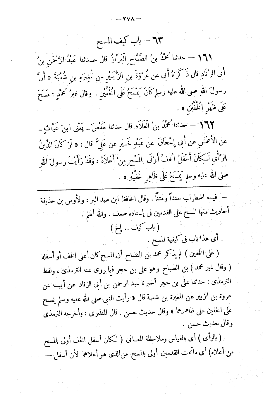 : بْن الصَّبَّاح وَهُوَ عَلِيّ بْن حَجَر فِيمَا رَوَى عَنْهُ التِّرْمِذِيّ ، وَلَفْظ التِّرْمِذِيّ : حَدَّثَنَا عَلِيّ بْن حَجَر أَخْبَرَنَا عَبْد الرَّحْمَن بْن أَبِي الزِّنَاد عَنْ أَبِيهِ عَنْ عُرْوَة بْن الزُّبَيْر عَنْ الْمُغِيرَة بْن شُعْبَة قَالَ " رَأَيْت النَّبِيّ صَلَّى اللَّه عَلَيْهِ وَسَلَّمَ يَمْسَح عَلَى الْخُفَّيْنِ عَلَى ظَاهِرهمَا " وَقَالَ حَدِيث حَسَن . قَالَ الْمُنْذِرِيُّ : وَأَخْرَجَهُ التِّرْمِذِيّ وَقَالَ حَدِيث حَسَن .