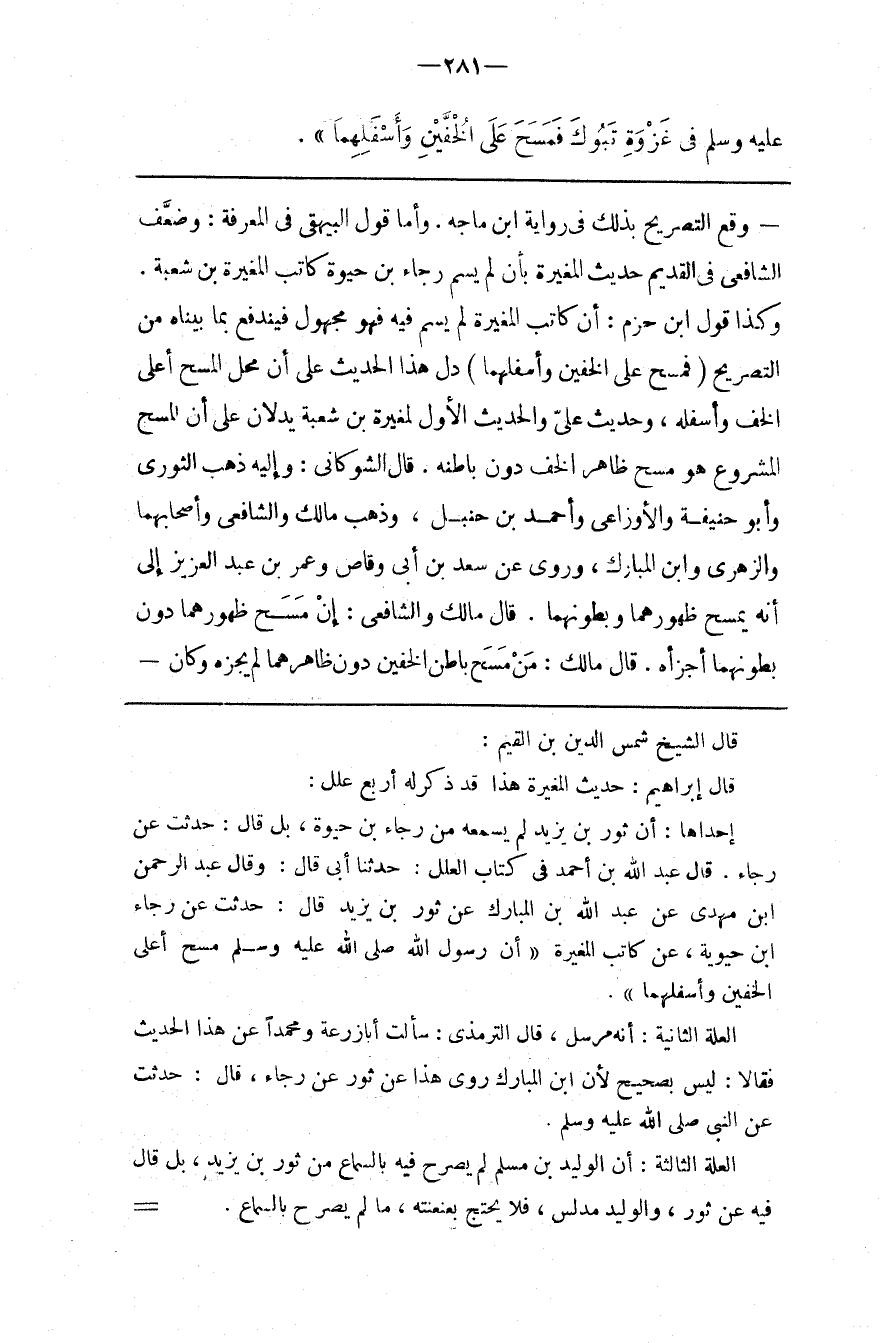 قال الشيخ شمس الدين بن القيم قال إبراهيم حديث المغيرة هذا قد ذكر له أربع علل إحداهما أن ثور بن يزيد لم يسمعه من رجاء بن حيوة بل قال حدثت عن رجاء