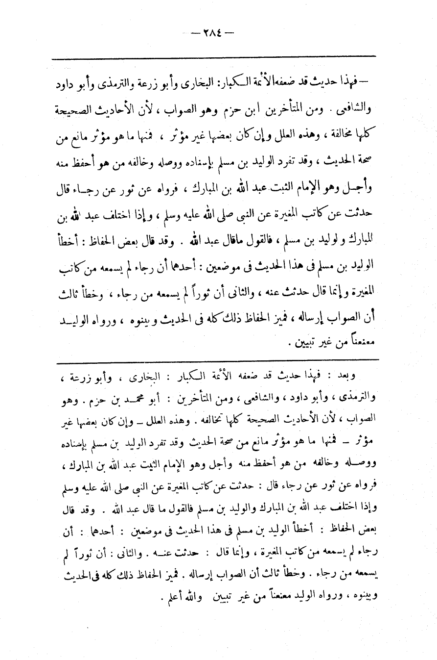 وهذه العلل وإن كان بعضها غير مؤثر فمنها ما هو مؤثر مانع من صحة الحديث وقد تفرد الوليد بن مسلم بإسناده ووصله وخالفه من هو أحفظ منه وأجل وهو الإمام الثبت عبد الله بن المبارك فرواه عن ثور عن رجاء قال حدثت عن كاتب المغيرة عن النبي صلى الله عليه و سلم وإذا اختلف عبد الله بن المبارك والوليد بن مسلم فالقول ما قال عبد الله