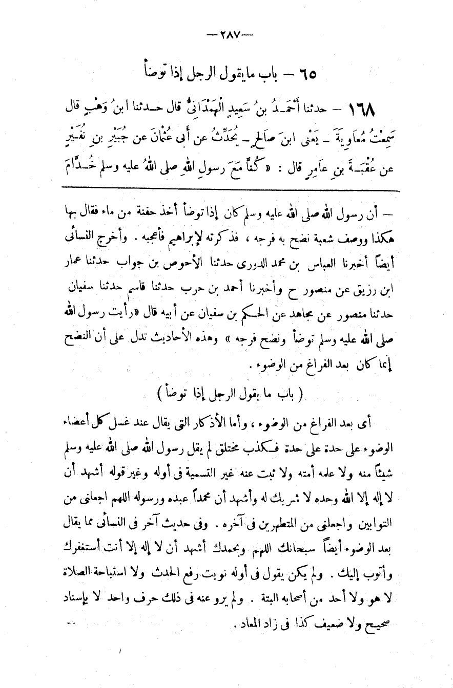 أَنَّ رَسُول اللَّه صَلَّى اللَّه عَلَيْهِ وَسَلَّمَ كَانَ إِذَا تَوَضَّأَ أَخَذَ حَفْنَة مِنْ مَاء فَقَالَ بِهَا هَكَذَا وَوَصَفَ شُعْبَة نَضَحَ بِهِ فَرْجه ، فَذَكَرْته لِإِبْرَاهِيم فَأَعْجَبَهُ . وَأَخْرَجَ النَّسَائِيُّ أَيْضًا أَخْبَرَنَا الْعَبَّاس بْن مُحَمَّد الدَّوْرِيّ حَدَّثَنَا الْأَحْوَصُ بْنُ جَوَّاب حَدَّثَنَا عَمَّار بْن رُزَيْق عَنْ مَنْصُور ح وَأَخْبَرَنَا أَحْمَد بْن حَرْب حَدَّثَنَا قَاسِم حَدَّثَنَا سُفْيَان حَدَّثَنَا مَنْصُور عَنْ مُجَاهِد عَنْ الْحَكَم بْن سُفْيَان عَنْ أَبِيهِ قَالَ " رَأَيْت رَسُول اللَّه صَلَّى اللَّه عَلَيْهِ وَسَلَّمَ تَوَضَّأَ وَنَضَحَ فَرْجه " وَهَذِهِ الْأَحَادِيث تَدُلّ عَلَى أَنَّ النَّضْح إِنَّمَا كَانَ بَعْد الْفَرَاغ مِنْ الْوُضُوء .