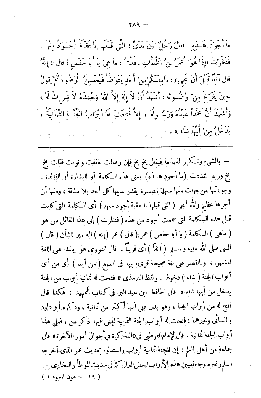 : دُخُولَهَا . وَلَفْظ التِّرْمِذِيّ ( فُتِحَتْ لَهُ ثَمَانِيَة أَبْوَاب مِنْ الْجَنَّة يَدْخُل مِنْ أَيّهَا شَاءَ ) قَالَ الْحَافِظ اِبْن عَبْد الْبَرّ فِي كِتَاب التَّمْهِيد : هَكَذَا قَالَ فُتِحَ لَهُ مِنْ أَبْوَاب الْجَنَّة ، وَهُوَ يَدُلّ عَلَى أَنَّهَا أَكْثَرُ مِنْ ثَمَانِيَة ، وَذَكَرَهُ أَبُو دَاوُدَ وَالنَّسَائِيُّ وَغَيْرهمَا : فُتِحَتْ لَهُ أَبْوَاب الْجَنَّة الثَّمَانِيَة لَيْسَ فِيهَا ذِكْر " مِنْ " ، فَعَلَى هَذَا أَبْوَابُ الْجَنَّة ثَمَانِيَةٌ . قَالَ الْإِمَام الْقُرْطُبِيّ فِي " التَّذْكِرَة فِي أَحْوَال أُمُور الْآخِرَة " قَالَ جَمَاعَة مِنْ أَهْل الْعِلْم : إِنَّ لِلْجَنَّةِ ثَمَانِيَة أَبْوَاب وَاسْتَدَلُّوا بِحَدِيثِ عُمَر الَّذِي أَخْرَجَهُ مُسْلِم وَغَيْره وَجَاءَ تَعْيِين هَذِهِ الْأَبْوَاب لِبَعْضِ الْعُمَّال كَمَا فِي حَدِيث الْمُوَطَّأ وَالْبُخَارِيّ @