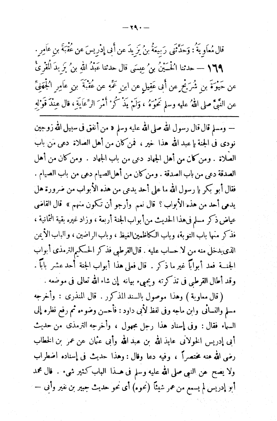 وَمُسْلِم قَالَ قَالَ رَسُول اللَّه صَلَّى اللَّه عَلَيْهِ وَسَلَّمَ " مَنْ أَنْفَقَ فِي سَبِيل اللَّه زَوْجَيْنِ نُودِيَ فِي الْجَنَّة يَا عَبْد اللَّه هَذَا خَيْر ، فَمَنْ كَانَ مِنْ أَهْل الصَّلَاة دُعِيَ مِنْ بَاب الصَّلَاة . وَمَنْ كَانَ مِنْ أَهْل الْجِهَاد دُعِيَ مِنْ بَاب الْجِهَاد . وَمَنْ كَانَ مِنْ أَهْل الصَّدَقَة دُعِيَ مِنْ بَاب الصَّدَقَة . وَمَنْ كَانَ مِنْ أَهْل الصِّيَام دُعِيَ مِنْ بَاب الصِّيَام . فَقَالَ أَبُو بَكْر يَا رَسُول اللَّه مَا عَلَى أَحَد يُدْعَى مِنْ هَذِهِ الْأَبْوَاب مِنْ ضَرُورَة هَلْ يُدْعَى أَحَد مِنْ هَذِهِ الْأَبْوَاب ؟ قَالَ نَعَمْ وَأَرْجُو أَنْ تَكُون مِنْهُمْ " قَالَ الْقَاضِي عِيَاض : ذَكَرَ مُسْلِم فِي هَذَا الْحَدِيث مِنْ أَبْوَاب الْجَنَّة أَرْبَعَة ، وَزَادَ غَيْره بَقِيَّة الثَّمَانِيَة ، فَذَكَرَ مِنْهَا بَاب التَّوْبَة ، وَبَاب الْكَاظِمِينَ الْغَيْظ ، وَبَاب الرَّاضِينَ ، وَالْبَاب الْأَيْمَن الَّذِي يَدْخُل مِنْهُ مَنْ لَا حِسَاب عَلَيْهِ . قَالَ الْقُرْطُبِيّ فَذَكَرَ الْحَكِيم التِّرْمِذِيّ أَبْوَاب الْجَنَّة فَعَدَّ أَبْوَابًا غَيْر مَا ذُكِرَ . قَالَ فَعَلَى هَذَا أَبْوَابُ الْجَنَّةِ أَحَدَ عَشَرَ بَابًا . وَقَدْ أَطَالَ الْقُرْطُبِيّ فِي تَذْكِرَته وَيَجِيء بَيَانه إِنْ شَاءَ اللَّه تَعَالَى فِي مَوْضِعه .