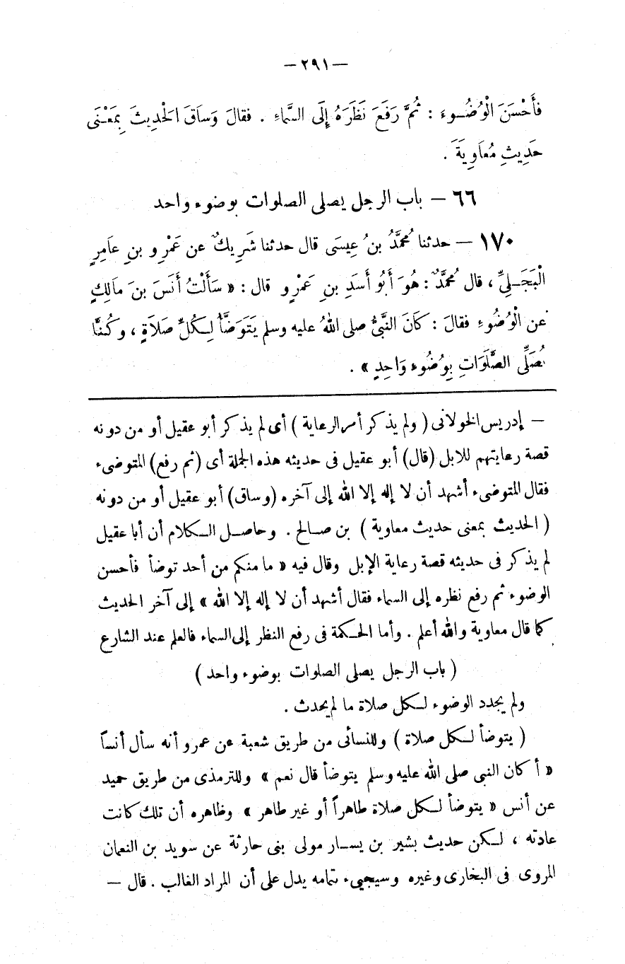 : وِلِلنَّسَائِيِّ مِنْ طَرِيق شُعْبَة عَنْ عَمْرو أَنَّهُ سَأَلَ أَنَسًا " أَكَانَ النَّبِيّ صَلَّى اللَّه عَلَيْهِ وَسَلَّمَ يَتَوَضَّأ قَالَ نَعَمْ " وَلِلتِّرْمِذِيِّ مِنْ طَرِيق حُمَيْدٍ عَنْ أَنَس " يَتَوَضَّأ لِكُلِّ صَلَاة طَاهِرًا أَوْ غَيْرَ طَاهِر " وَظَاهِره أَنَّ تِلْكَ كَانَتْ عَادَتَهُ ، لَكِنَّ حَدِيث بُشَيْر بْن يَسَار مَوْلَى بَنِي حَارِثَة عَنْ سُوَيْد بْن النُّعْمَان الْمَرْوِيّ فِي الْبُخَارِيّ وَغَيْره وَسَيَجِيءُ تَمَامه يَدُلّ عَلَى أَنَّ الْمُرَاد الْغَالِب . قَالَ @