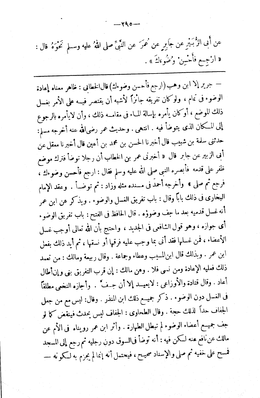 : قَالَ الْخَطَّابِيُّ : ظَاهِر مَعْنَاهُ إِعَادَة الْوُضُوء فِي تَمَام ، وَلَوْ كَانَ تَفْرِيقه جَائِزًا لَأَشْبَهَ أَنْ يَقْتَصِر فِيهِ عَلَى الْأَمْر بِغَسْلِ ذَلِكَ الْمَوْضِع ، أَوْ كَانَ يَأْمُرهُ بِإِسَالَةِ الْمَاء فِي مَقَامه ذَلِكَ ، وَأَنْ لَا يَأْمُرهُ بِالرُّجُوعِ إِلَى الْمَكَان الَّذِي يَتَوَضَّأ فِيهِ . اِنْتَهَى . وَحَدِيث عُمَر رَضِيَ اللَّه عَنْهُ أَخْرَجَهُ مُسْلِم : حَدَّثَنِي سَلَمَة بْن شَبِيب قَالَ أَخْبَرَنَا الْحَسَن بْن مُحَمَّد بْن أَعْيَن قَالَ أَخْبَرَنَا مَعْقِل عَنْ أَبِي الزُّبَيْر عَنْ جَابِر قَالَ " أَخْبَرَنِي عُمَر بْن الْخَطَّاب أَنَّ رَجُلًا تَوَضَّأَ فَتَرَكَ مَوْضِع ظُفُر عَلَى قَدَمه فَأَبْصَرَهُ النَّبِيّ صَلَّى اللَّه عَلَيْهِ وَسَلَّمَ فَقَالَ : اِرْجِعْ فَأَحْسِنْ وُضُوءَك ، فَرَجَعَ ثُمَّ صَلَّى " وَأَخْرَجَهُ أَحْمَد فِي مُسْنَده مِثْله وَزَادَ : ثُمَّ تَوَضَّأَ . وَعَقَدَ الْإِمَام الْبُخَارِيّ فِي ذَلِكَ بَابًا وَقَالَ : بَاب تَفْرِيق الْغُسْل وَالْوُضُوء . وَيُذْكَر عَنْ اِبْن عُمَر أَنَّهُ غَسَلَ قَدَمَيْهِ بَعْدَمَا جَفَّ وُضُوءُهُ . قَالَ الْحَافِظ فِي الْفَتْح : بَاب تَفْرِيق الْوُضُوء أَيْ جَوَازه ، وَهُوَ قَوْل الشَّافِعِيّ فِي الْجَدِيد ، وَاحْتَجَّ بِأَنَّ اللَّه تَعَالَى أَوْجَبَ غَسْل الْأَعْضَاء ، فَمَنْ غَسَلَهَا فَقَدْ أَتَى بِمَا وَجَبَ عَلَيْهِ فَرَّقَهَا أَوْ نَسَّقَهَا ، ثُمَّ أَيَّدَ ذَلِكَ بِفِعْلِ اِبْن عُمَر . وَبِذَلِكَ قَالَ اِبْن الْمُسَيِّب وَعَطَاء وَجَمَاعَة . وَقَالَ رَبِيعَة وَمَالِك : مَنْ تَعَمَّدَ ذَلِكَ فَعَلَيْهِ الْإِعَادَة وَمَنْ نَسِيَ فَلَا . وَعَنْ مَالِك . إِنْ قَرُبَ التَّفْرِيق بَنَى وَإِنْ أَطَالَ أَعَادَ . وَقَالَ قَتَادَةُ وَالْأَوْزَاعِيُّ : لَا يُعِيد إِلَّا إِنْ جَفَّ . وَأَجَازَهُ النَّخَعِيُّ مُطْلَقًا فِي الْغُسْل دُون الْوُضُوء . ذَكَرَ جَمِيع ذَلِكَ اِبْن الْمُنْذِر . وَقَالَ : لَيْسَ مَعَ مَنْ جَعَلَ الْجَفَاف حَدًّا لِذَلِكَ حُجَّة . وَقَالَ الطَّحَاوِيُّ : الْجَفَاف لَيْسَ بِحَدَثٍ فَيَنْقُض كَمَا لَوْ جَفَّ جَمِيع أَعْضَاء الْوُضُوء لَمْ تَبْطُل الطَّهَارَة . وَأَثَر اِبْن عُمَر رَوِّينَاهُ فِي الْأُمّ عَنْ مَالِك عَنْ نَافِع عَنْهُ لَكِنْ فِيهِ : أَنَّهُ تَوَضَّأَ فِي السُّوق دُون رِجْلَيْهِ ثُمَّ رَجَعَ إِلَى الْمَسْجِد فَمَسَحَ عَلَى خُفَّيْهِ ثُمَّ صَلَّى وَالْإِسْنَاد صَحِيح ، فَيَحْتَمِل أَنَّهُ إِنَّمَا لَمْ يَجْزِم بِهِ لِكَوْنِهِ@