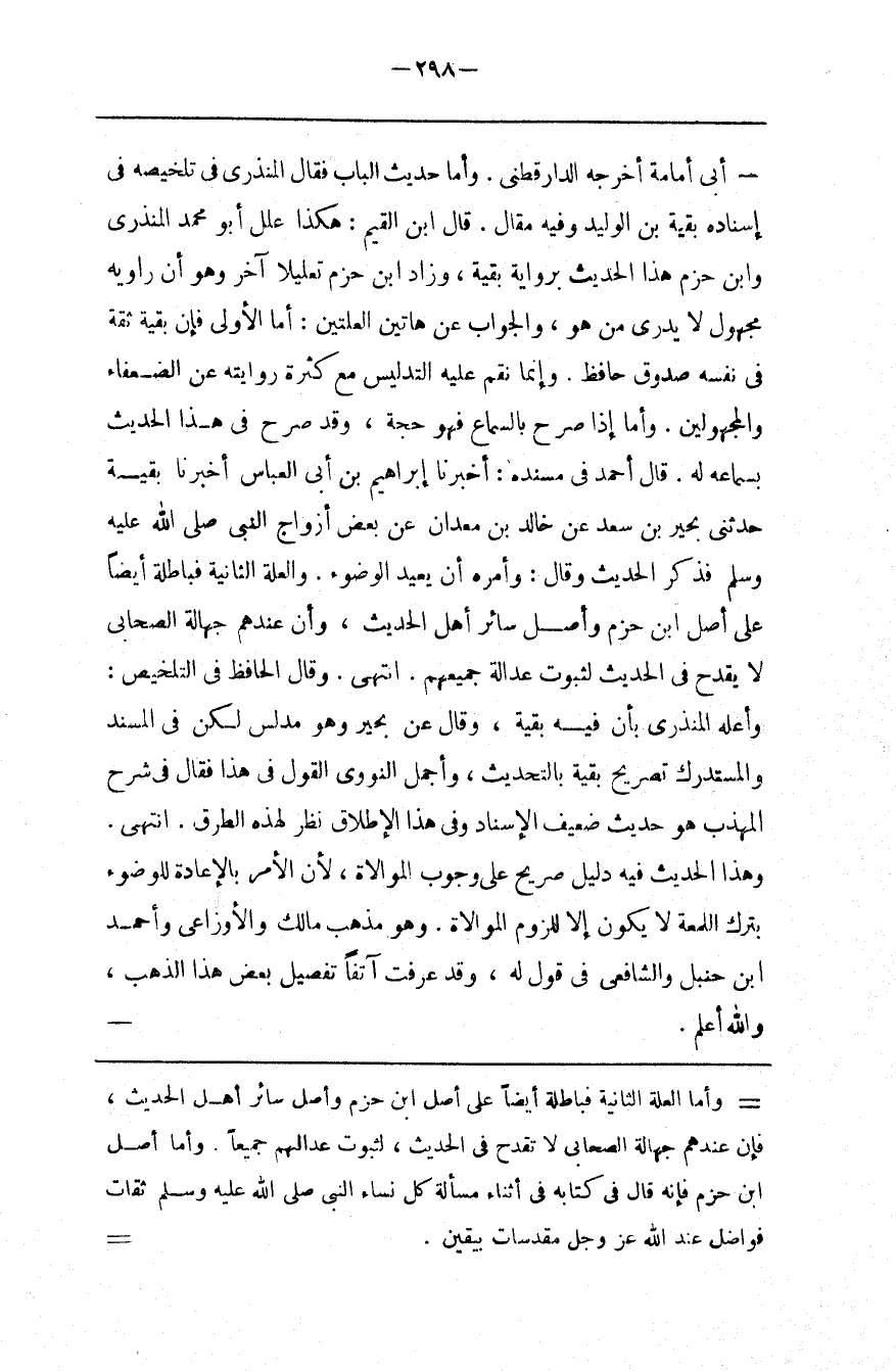 وأما العلة الثانية فباطلة أيضا على أصل ابن حزم وأصل سائر أهل الحديث فإن عندهم جهالة الصحابي لا تقدح في الحديث لثبوت عدالتهم جميعا وأما أصل ابن حزم فإنه قال في كتابه في أثناء مسألة كل نساء النبي صلى الله عليه و سلم ثقات فواضل عند الله عز و جل مقدسات بيقين