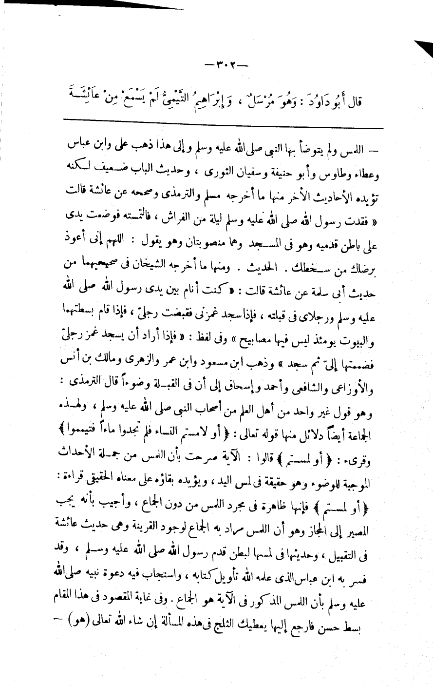 اللَّمْس وَلَمْ يَتَوَضَّأ بِهَا النَّبِيّ صَلَّى اللَّه عَلَيْهِ وَسَلَّمَ وَإِلَى هَذَا ذَهَبَ عَلِيّ وَابْن عَبَّاس وَعَطَاء وَطَاوُسٌ وَأَبُو حَنِيفَة وَسُفْيَان الثَّوْرِيُّ ، وَحَدِيث الْبَاب ضَعِيف لَكِنَّهُ تُؤَيِّدهُ الْأَحَادِيث الْأُخَر مِنْهَا مَا أَخْرَجَهُ مُسْلِم وَالتِّرْمِذِيّ وَصَحَّحَهُ عَنْ عَائِشَة قَالَتْ " فَقَدْت رَسُول اللَّه صَلَّى اللَّه عَلَيْهِ وَسَلَّمَ لَيْلَة مِنْ الْفِرَاش ، فَالْتَمَسْته فَوَضَعْت يَدِي عَلَى بَاطِن قَدَمَيْهِ وَهُوَ فِي الْمَسْجِد وَهُمَا مَنْصُوبَتَانِ وَهُوَ يَقُول : اللَّهُمَّ إِنِّي أَعُوذ بِرِضَاك مِنْ سَخَطك . الْحَدِيث . وَمِنْهَا مَا أَخْرَجَهُ الشَّيْخَانِ فِي صَحِيحَيْهِمَا مِنْ حَدِيث أَبِي سَلَمَة عَنْ عَائِشَة قَالَتْ : " كُنْت أَنَام بَيْن يَدَيْ رَسُول اللَّه صَلَّى اللَّه عَلَيْهِ وَسَلَّمَ وَرِجْلَايَ فِي قِبْلَته ، فَإِذَا سَجَدَ غَمَزَنِي فَقَبَضْت رِجْلِي ، فَإِذَا قَامَ بَسَطْتهمَا وَالْبُيُوت يَوْمَئِذٍ لَيْسَ فِيهَا مَصَابِيح " وَفِي لَفْظ : " فَإِذَا أَرَادَ أَنْ يَسْجُد غَمَزَ رِجْلِي فَضَمَمْتهَا إِلَيَّ ثُمَّ سَجَدَ " وَذَهَبَ اِبْن مَسْعُود وَابْن عُمَر وَالزُّهْرِيّ وَمَالِك بْن أَنَس وَالْأَوْزَاعِيُّ وَالشَّافِعِيّ وَأَحْمَد وَإِسْحَاق إِلَى أَنَّ فِي الْقُبْلَة وُضُوءًا قَالَ التِّرْمِذِيّ : وَهُوَ قَوْل غَيْر وَاحِد مِنْ أَهْل الْعِلْم مِنْ أَصْحَاب النَّبِيّ صَلَّى اللَّه عَلَيْهِ وَسَلَّمَ ، وَلِهَذِهِ الْجَمَاعَة أَيْضًا دَلَائِل مِنْهَا قَوْله تَعَالَى : { أَوْ لَامَسْتُمْ النِّسَاء فَلَمْ تَجِدُوا مَاء فَتَيَمَّمُوا } وَقُرِئَ : { أَوْ لَمَسْتُمْ } قَالُوا : الْآيَة صَرَّحَتْ بِأَنَّ اللَّمْس مِنْ جُمْلَة الْأَحْدَاث الْمُوجِبَة لِلْوُضُوءِ وَهُوَ حَقِيقَة فِي لَمْس الْيَد ، وَيُؤَيِّدهُ بَقَاؤُهُ عَلَى مَعْنَاهُ الْحَقِيقِيّ قِرَاءَة : { أَوْ لَمَسْتُمْ } فَإِنَّهَا ظَاهِرَة فِي مُجَرَّد اللَّمْس مِنْ دُون الْجِمَاع ، وَأُجِيبَ بِأَنَّهُ يَجِب الْمَصِير إِلَى الْمَجَاز وَهُوَ أَنَّ اللَّمْس مُرَاد بِهِ الْجِمَاع لِوُجُودِ الْقَرِينَة وَهِيَ حَدِيث عَائِشَة فِي التَّقْبِيل ، وَحَدِيثهَا فِي لَمْسهَا لِبَطْنِ قَدَم رَسُول اللَّه صَلَّى اللَّه عَلَيْهِ وَسَلَّمَ ، وَقَدْ فَسَّرَ بِهِ اِبْن عَبَّاس الَّذِي عَلَّمَهُ اللَّه تَأْوِيل كِتَابه ، وَاسْتَجَابَ فِيهِ دَعْوَة نَبِيّه صَلَّى اللَّه عَلَيْهِ وَسَلَّمَ بِأَنَّ اللَّمْس الْمَذْكُور فِي الْآيَة هُوَ الْجِمَاع ، وَفِي غَايَة الْمَقْصُود فِي هَذَا الْمَقَام بَسْط حَسَن فَارْجِعْ إِلَيْهَا يُعْطِيك الثَّلْج فِي هَذِهِ الْمَسْأَلَة إِنْ شَاءَ اللَّه تَعَالَى