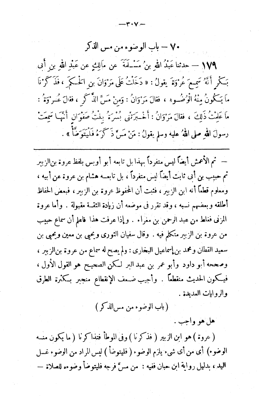 ثُمَّ الْأَعْمَش أَيْضًا لَيْسَ مُتَفَرِّدًا بِهَذَا تَابَعَهُ أَبُو أُوَيْس بِلَفْظِ عُرْوَة بْن الزُّبَيْر ثُمَّ حَبِيب بْن أَبِي ثَابِت أَيْضًا لَيْسَ مُتَفَرِّدًا ، بَلْ تَابَعَهُ هِشَام بْن عُرْوَة عَنْ أَبِيهِ ، وَمَعْلُوم قَطْعًا أَنَّهُ اِبْن الزُّبَيْر ، فَثَبَتَ أَنَّ الْمَحْفُوظ عُرْوَة بْن الزُّبَيْر ، فَبَعْض الْحُفَّاظ أَطْلَقَهُ وَبَعْضهمْ نَسَبَهُ ، وَقَدْ تَقَرَّرَ فِي مَوْضِعه أَنَّ زِيَادَة الثِّقَة مَقْبُولَة . وَأَمَّا عُرْوَة الْمُزَنِيُّ فَغَلَط مِنْ عَبْد الرَّحْمَن بْن مَغْرَاء . وَإِذَا عَرَفْت هَذَا فَاعْلَمْ أَنَّ سَمَاع حَبِيب مِنْ عُرْوَة بْن الزُّبَيْر مُتَكَلَّم فِيهِ . وَقَالَ سُفْيَان الثَّوْرِيّ وَيَحْيَى بْن مَعِين وَيَحْيَى بْن سَعِيد الْقَطَّان وَمُحَمَّد بْن إِسْمَاعِيل الْبُخَارِيّ : وَلَمْ يَصِحّ لَهُ سَمَاع مِنْ عُرْوَة بْن الزُّبَيْر ، وَصَحَّحَهُ أَبُو دَاوُدَ وَأَبُو عُمَر بْن عَبْد الْبَرّ لَكِنْ الصَّحِيح هُوَ الْقَوْل الْأَوَّل ، فَيَكُون الْحَدِيث مُنْقَطِعًا . وَأُجِيبَ ضَعْف الِانْقِطَاع مُنْجَبِر بِكَثْرَةِ الطُّرُق وَالرِّوَايَات الْعَدِيدَة .