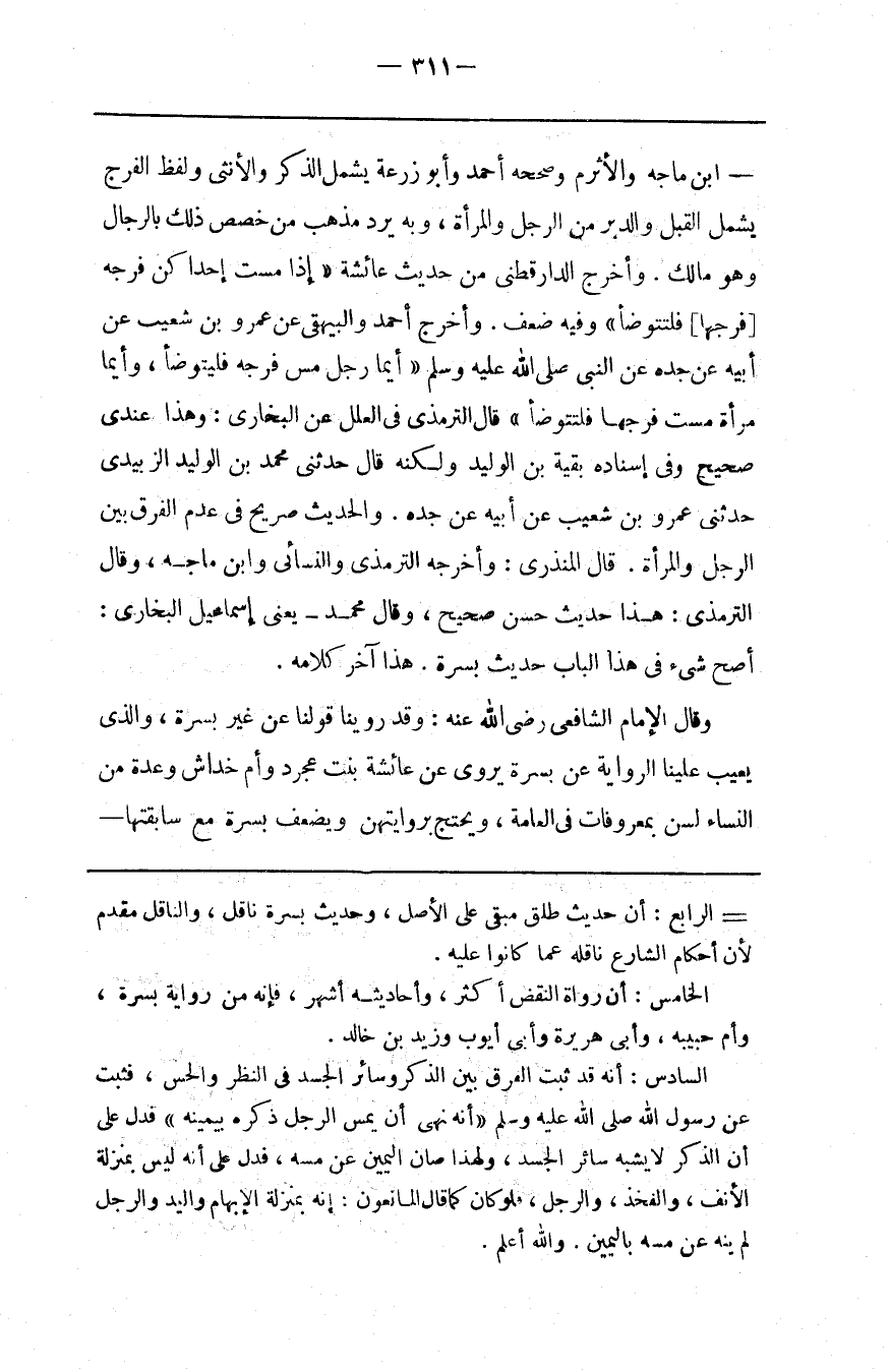 الخامس أن رواة النقض أكثر وأحاديثه أشهر فإنه من رواية بسرة وأم حبيبة وأبي هريرة وأبي أيوب وزيد بن خالد