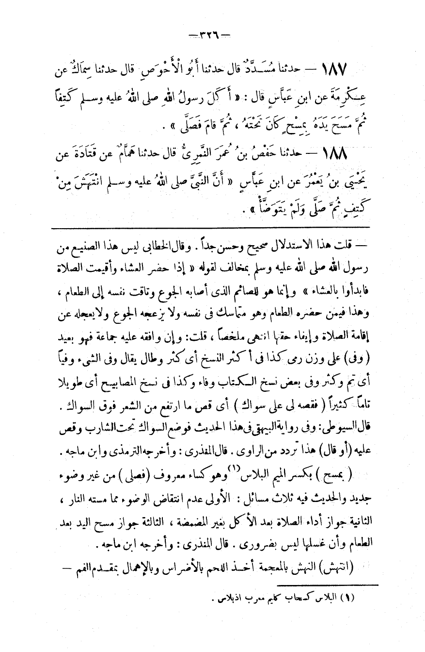 : مِنْ غَيْر وُضُوء جَدِيد وَالْحَدِيث فِيهِ ثَلَاث مَسَائِل : الْأُولَى عَدَم اِنْتِقَاض الْوُضُوء مِمَّا مَسَّتْهُ النَّار ، الثَّانِيَة جَوَاز أَدَاء الصَّلَاة بَعْد الْأَكْل بِغَيْرِ الْمَضْمَضَة ، الثَّالِثَة جَوَاز مَسْح الْيَد بَعْد الطَّعَام وَأَنَّ غَسْلهَا لَيْسَ بِضَرُورِيٍّ . قَالَ الْمُنْذِرِيُّ : وَأَخْرَجَهُ اِبْن مَاجَهْ .