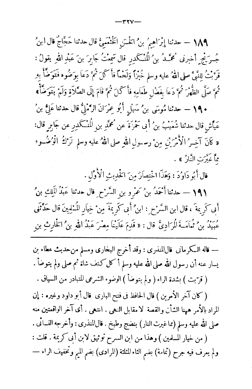 قَالَهُ الْكَرْمَانِيُّ قَالَ الْمُنْذِرِيُّ : وَقَدْ أَخْرَجَ الْبُخَارِيّ وَمُسْلِم مِنْ حَدِيث عَطَاء بْن يَسَار عَنْهُ أَنَّ رَسُول اللَّه صَلَّى اللَّه عَلَيْهِ وَسَلَّمَ أَكَلَ كَتِف شَاة ثُمَّ صَلَّى وَلَمْ يَتَوَضَّأ .