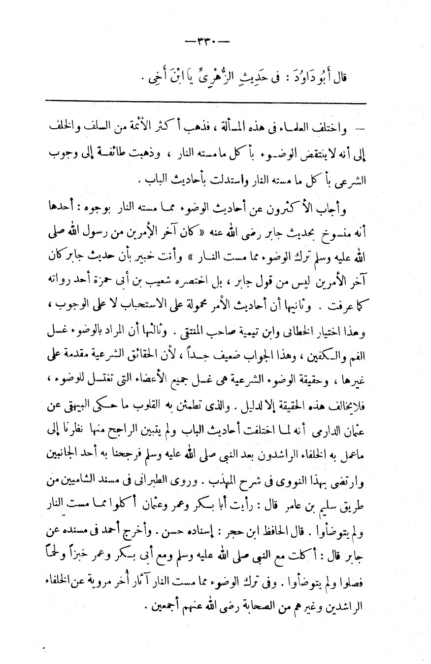 وَثَالِثهَا : أَنَّ الْمُرَاد بِالْوُضُوءِ غَسْل الْفَم وَالْكَفَّيْنِ ، وَهَذَا الْجَوَاب ضَعِيف جِدًّا ، لِأَنَّ الْحَقَائِق الشَّرْعِيَّة مُقَدَّمَة عَلَى غَيْرهَا ، وَحَقِيقَة الْوُضُوء الشَّرْعِيَّة هِيَ غَسْل جَمِيع الْأَعْضَاء الَّتِي تُغْتَسَل لِلْوُضُوءِ ، فَلَا يُخَالِف هَذِهِ الْحَقِيقَة إِلَّا لِدَلِيلٍ . وَاَلَّذِي تَطْمَئِنّ بِهِ الْقُلُوب مَا حَكَى الْبَيْهَقِيُّ عَنْ عُثْمَان الدَّارِمِيِّ أَنَّهُ لَمَّا اِخْتَلَفَتْ أَحَادِيث الْبَاب وَلَمْ يَتَبَيَّن الرَّاجِح مِنْهَا نَظَرْنَا إِلَى مَا عَمِلَ بِهِ الْخُلَفَاء الرَّاشِدُونَ بَعْد النَّبِيّ صَلَّى اللَّه عَلَيْهِ وَسَلَّمَ فَرَجَّحْنَا بِهِ أَحَد الْجَانِبَيْنِ وَارْتَضَى بِهَذَا النَّوَوِيّ فِي شَرْح الْمُهَذَّب . وَرَوَى الطَّبَرَانِيُّ فِي مُسْنَد الشَّامِيِّينَ مِنْ طَرِيق سُلَيْم بْن عَامِر قَالَ : رَأَيْت أَبَا بَكْر وَعُمَر وَعُثْمَان أَكَلُوا مِمَّا مَسَّتْ النَّار وَلَمْ يَتَوَضَّئُوا . قَالَ الْحَافِظ اِبْن حَجَرٍ : إِسْنَاده حَسَن . وَأَخْرَجَ أَحْمَد فِي مُسْنَده عَنْ جَابِر قَالَ . أَكَلْت مَعَ النَّبِيّ صَلَّى اللَّه عَلَيْهِ وَسَلَّمَ وَمَعَ أَبِي بَكْر وَعُمَر خُبْزًا وَلَحْمًا فَصَلَّوْا وَلَمْ يَتَوَضَّئُوا . وَفِي تَرْك الْوُضُوء مِمَّا مَسَّ النَّار آثَار أُخَر مَرْوِيَّة عَنْ الْخُلَفَاء الرَّاشِدِينَ وَغَيْرهمْ مِنْ الصَّحَابَة رَضِيَ اللَّه عَنْهُمْ أَجْمَعِينَ .@