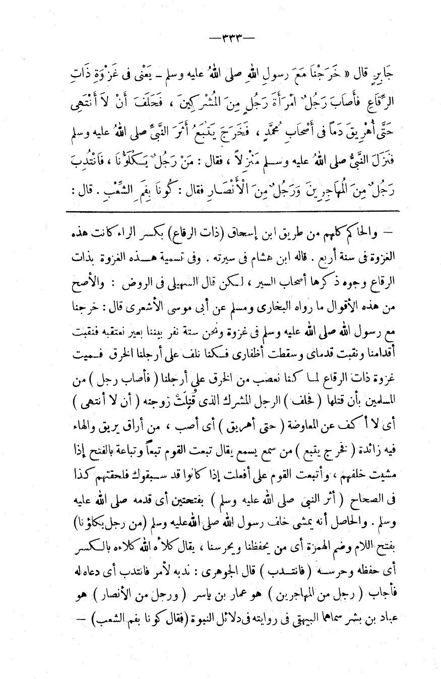 : بِكَسْرِ الرَّاء كَانَتْ هَذِهِ الْغَزْوَة فِي سَنَة أَرْبَع . قَالَهُ اِبْن هِشَام فِي سِيرَته . وَفِي تَسْمِيَة هَذِهِ الْغَزْوَة بِذَاتِ الرِّقَاع وُجُوه ذَكَرَهَا أَصْحَاب السِّيَر ، لَكِنْ قَالَ السُّهَيْلِيّ فِي الرَّوْض : وَالْأَصَحّ مِنْ هَذِهِ الْأَقْوَال مَا رَوَاهُ الْبُخَارِيّ وَمُسْلِم عَنْ أَبِي مُوسَى الْأَشْعَرِيّ قَالَ : خَرَجْنَا مَعَ رَسُول اللَّه صَلَّى اللَّه عَلَيْهِ وَسَلَّمَ فِي غَزْوَة وَنَحْنُ سِتَّة نَفَر بَيْننَا بَعِير نَعْتَقِبهُ فَنَقِبَتْ أَقْدَامنَا وَنَقِبَتْ قَدَمَايَ وَسَقَطَتْ أَظْفَارِي فَكُنَّا نَلُفّ عَلَى أَرْجُلنَا الْخِرَق فَسُمِّيَتْ غَزْوَة ذَات الرِّقَاع لِمَا كُنَّا نَعْصِب مِنْ الْخِرَق عَلَى أَرْجُلنَا
