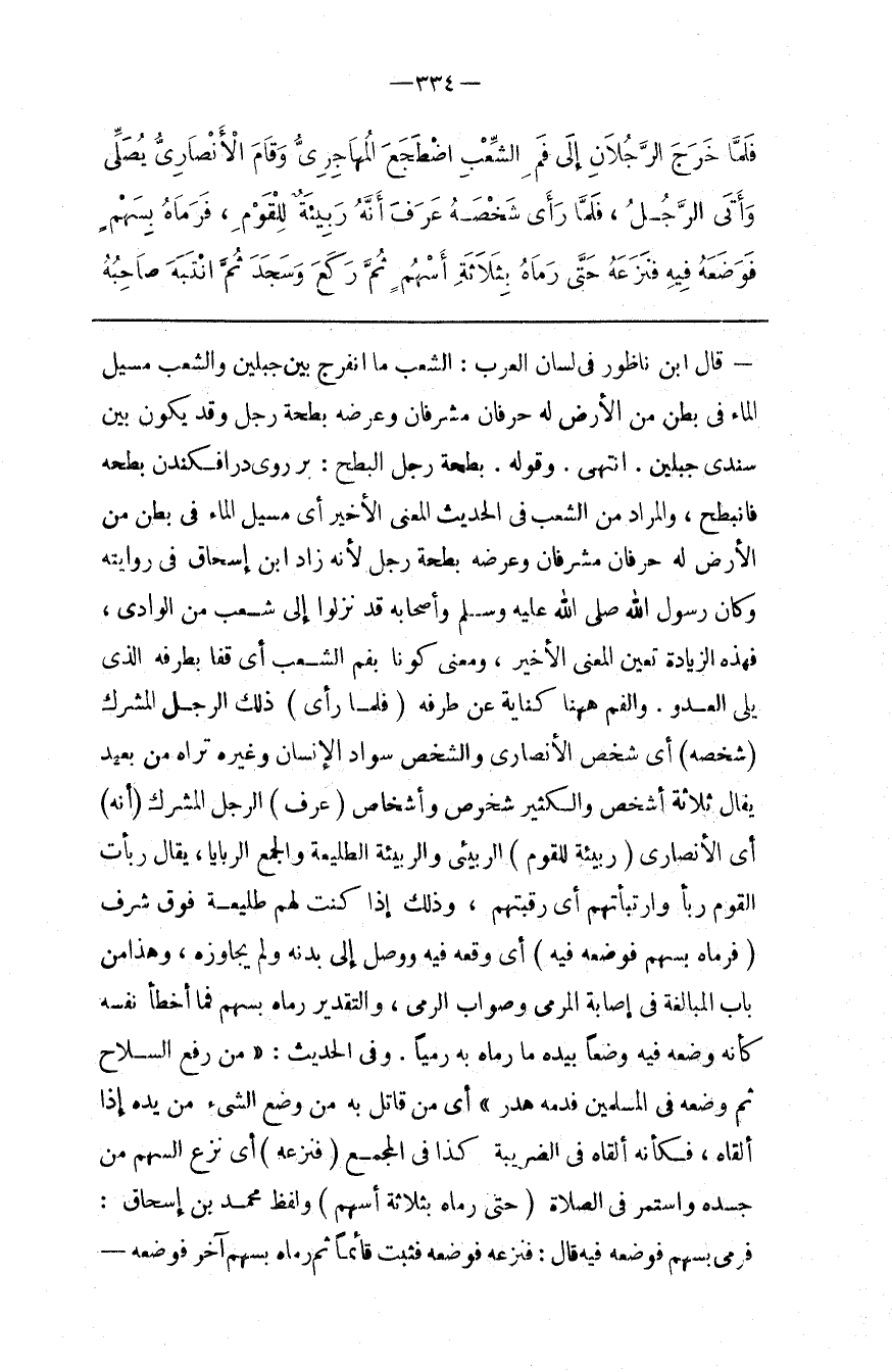 : قَالَ اِبْن نَاظُور فِي لِسَان الْعَرَب : الشِّعْب مَا اِنْفَرَجَ بَيْن جَبَلَيْنِ وَالشِّعْب مَسِيل الْمَاء فِي بَطْن مِنْ الْأَرْض لَهُ حَرْفَانِ مُشْرِفَانِ وَعَرْضه بَطْحَة رَجُل وَقَدْ يَكُون بَيْن سَنَدَيْ جَبَلَيْنِ . اِنْتَهَى . وَقَوْله . بَطْحَة رَجُل الْبَطْح : بر روى درافكندن بَطَحَهُ فَانْبَطَحَ ، وَالْمُرَاد مِنْ الشِّعْب فِي الْحَدِيث الْمَعْنَى الْأَخِير أَيْ مَسِيل الْمَاء فِي بَطْن مِنْ الْأَرْض لَهُ حَرْفَانِ مُشْرِفَانِ وَعَرْضه بَطْحَة رَجُل لِأَنَّهُ زَادَ اِبْن إِسْحَاق فِي رِوَايَته وَكَانَ رَسُول اللَّه صَلَّى اللَّه عَلَيْهِ وَسَلَّمَ وَأَصْحَابه قَدْ نَزَلُوا إِلَى شِعْب مِنْ الْوَادِي ، فَهَذِهِ الزِّيَادَة تُعَيِّن الْمَعْنَى الْأَخِير ، وَمَعْنَى كُونَا بِفَمِ الشِّعْب أَيْ قِفَا بِطَرَفِهِ الَّذِي يَلِي الْعَدُوّ . وَالْفَم هَاهُنَا كِنَايَة عَنْ طَرَفه