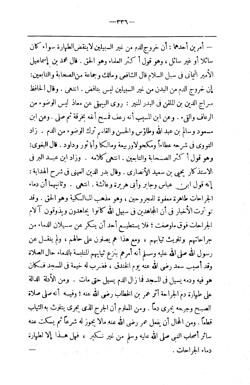 وَثَانِيهمَا : أَنَّ دِمَاء الْجِرَاحَات طَاهِرَة مَعْفُوَّة لِلْمَجْرُوحِينَ ، وَهُوَ مَذْهَب الْمَالِكِيَّة وَهُوَ الْحَقّ . وَقَدْ تَوَاتَرَتْ الْأَخْبَار فِي أَنَّ الْمُجَاهِدِينَ فِي سَبِيل اللَّه كَانُوا يُجَاهِدُونَ وَيَذُوقُونَ آلَام الْجِرَاحَات فَوْق مَا وَصَفْت ؛ فَلَا يَسْتَطِيع أَحَد أَنْ يُنْكِر عَنْ سَيَلَان الدِّمَاء مِنْ جِرَاحَاتهمْ وَتَلْوِيث ثِيَابهمْ ، وَمَعَ هَذَا هُمْ يُصَلُّونَ عَلَى حَالهمْ ، وَلَمْ يُنْقَل عَنْ رَسُول اللَّه صَلَّى اللَّه عَلَيْهِ وَسَلَّمَ أَنَّهُ أَمَرَهُمْ بِنَزْعِ ثِيَابهمْ الْمُتَلَبِّسَة بِالدِّمَاءِ حَال الصَّلَاة وَقَدْ أُصِيبَ سَعْد رَضِيَ اللَّه عَنْهُ يَوْم الْخَنْدَق ، فَضَرَبَ لَهُ خَيْمَة فِي الْمَسْجِد فَكَانَ هُوَ فِيهِ وَدَمه يَسِيل فِي الْمَسْجِد فَمَا زَالَ الدَّم يَسِيل حَتَّى مَاتَ . وَمِنْ الْأَدِلَّة الدَّالَّة عَلَى طَهَارَة دَم الْجِرَاحَة أَثَر عُمَر بْن الْخَطَّاب رَضِيَ اللَّه عَنْهُ ؛ وَفِيهِ أَنَّهُ صَلَّى صَلَاة الصُّبْح وَجُرْحه يَجْرِي دَمًا . وَمِنْ الْمَعْلُوم أَنَّ الْجُرْح الَّذِي يَجْرِي يَتَلَوَّث بِهِ الثِّيَاب قَطْعًا . وَمِنْ الْمُحَال أَنْ يَفْعَل عُمَر رَضِيَ اللَّه عَنْهُ مَا لَا يَجُوز لَهُ شَرْعًا ثُمَّ يَسْكُت عَنْهُ سَائِر أَصْحَاب النَّبِيّ صَلَّى اللَّه عَلَيْهِ وَسَلَّمَ مِنْ غَيْر نَكِير ، فَهَلْ هَذَا إِلَّا لِطَهَارَةِ دِمَاء الْجِرَاحَات .@