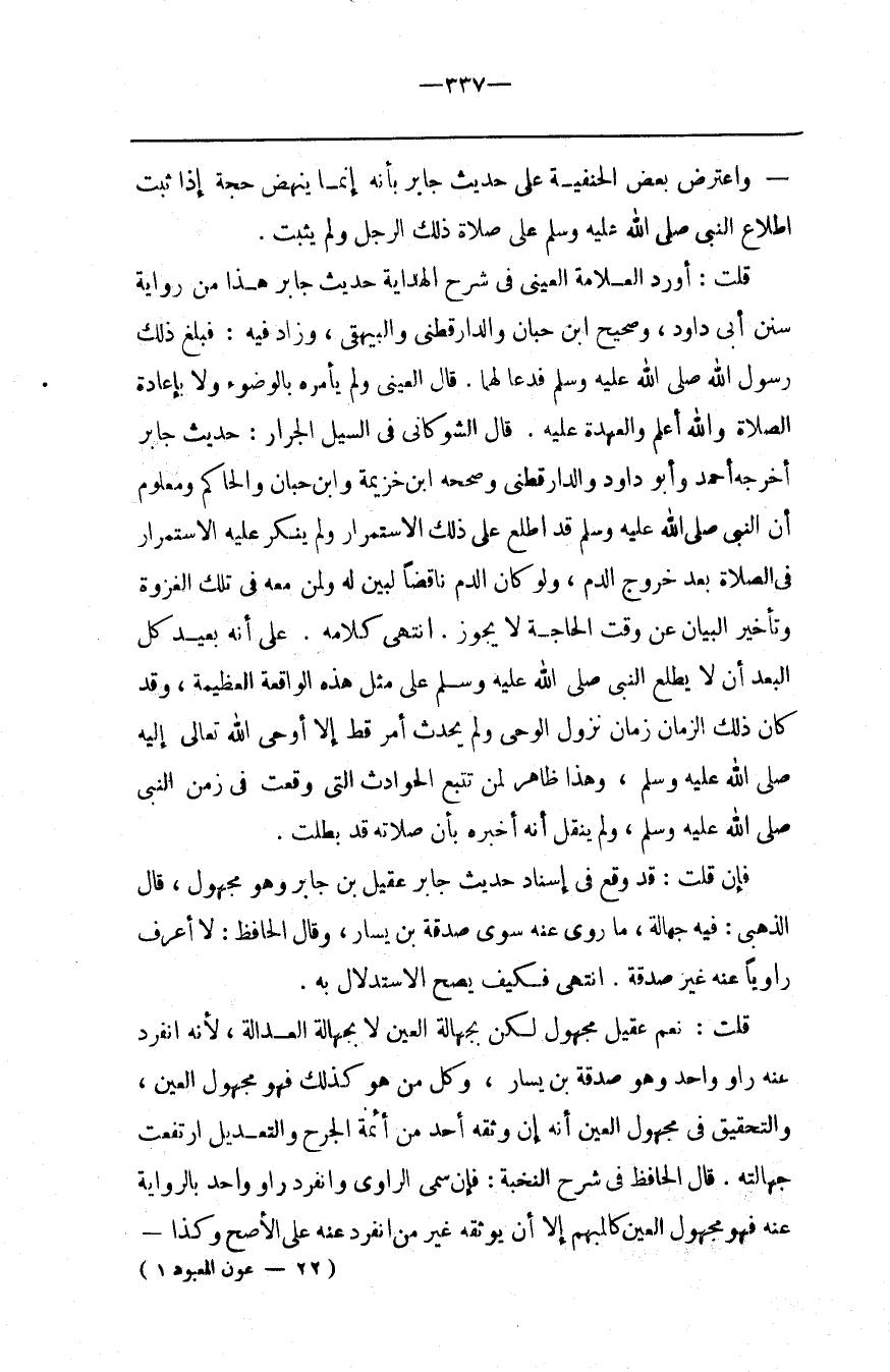 قُلْت : أَوْرَدَ الْعَلَّامَة الْعَيْنِيّ فِي شَرْح الْهِدَايَة حَدِيث جَابِر هَذَا مِنْ رِوَايَة سُنَن أَبِي دَاوُدَ ، وَصَحِيح اِبْن حِبَّان وَالدَّارَقُطْنِيّ وَالْبَيْهَقِيّ ، وَزَادَ فِيهِ : فَبَلَغَ ذَلِكَ رَسُول اللَّه صَلَّى اللَّه عَلَيْهِ وَسَلَّمَ فَدَعَا لَهُمَا . قَالَ الْعَيْنِيّ وَلَمْ يَأْمُرهُ بِالْوُضُوءِ وَلَا بِإِعَادَةِ الصَّلَاة وَاَللَّه أَعْلَم وَالْعُهْدَة عَلَيْهِ . قَالَ الشَّوْكَانِيُّ فِي السَّيْل الْجَرَّار : حَدِيث جَابِر أَخْرَجَهُ أَحْمَد وَأَبُو دَاوُدَ وَالدَّارَقُطْنِيّ وَصَحَّحَهُ اِبْن خُزَيْمَةَ وَابْن حِبَّان وَالْحَاكِم وَمَعْلُوم أَنَّ النَّبِيّ صَلَّى اللَّه عَلَيْهِ وَسَلَّمَ قَدْ اِطَّلَعَ عَلَى ذَلِكَ الِاسْتِمْرَار وَلَمْ يُنْكِر عَلَيْهِ الِاسْتِمْرَار فِي الصَّلَاة بَعْد خُرُوج الدَّم ، وَلَوْ كَانَ الدَّم نَاقِضًا لَبَيَّنَ لَهُ وَلِمَنْ مَعَهُ فِي تِلْكَ الْغَزْوَة وَتَأْخِير الْبَيَان عَنْ وَقْت الْحَاجَة لَا يَجُوز . اِنْتَهَى كَلَامه . عَلَى أَنَّهُ بَعِيد كُلّ الْبُعْد أَنْ لَا يَطَّلِع النَّبِيّ صَلَّى اللَّه عَلَيْهِ وَسَلَّمَ عَلَى مِثْل هَذِهِ الْوَاقِعَة الْعَظِيمَة ، وَقَدْ كَانَ ذَلِكَ الزَّمَان زَمَان نُزُول الْوَحْي وَلَمْ يَحْدُث أَمْر قَطّ إِلَّا أَوْحَى اللَّه تَعَالَى إِلَيْهِ صَلَّى اللَّه عَلَيْهِ وَسَلَّمَ ، وَهَذَا ظَاهِر لِمَنْ تَتَبَّعَ الْحَوَادِث الَّتِي وَقَعَتْ فِي زَمَن النَّبِيّ صَلَّى اللَّه عَلَيْهِ وَسَلَّمَ ، وَلَمْ يُنْقَل أَنَّهُ أَخْبَرَهُ بِأَنَّ صَلَاته قَدْ بَطَلَتْ .