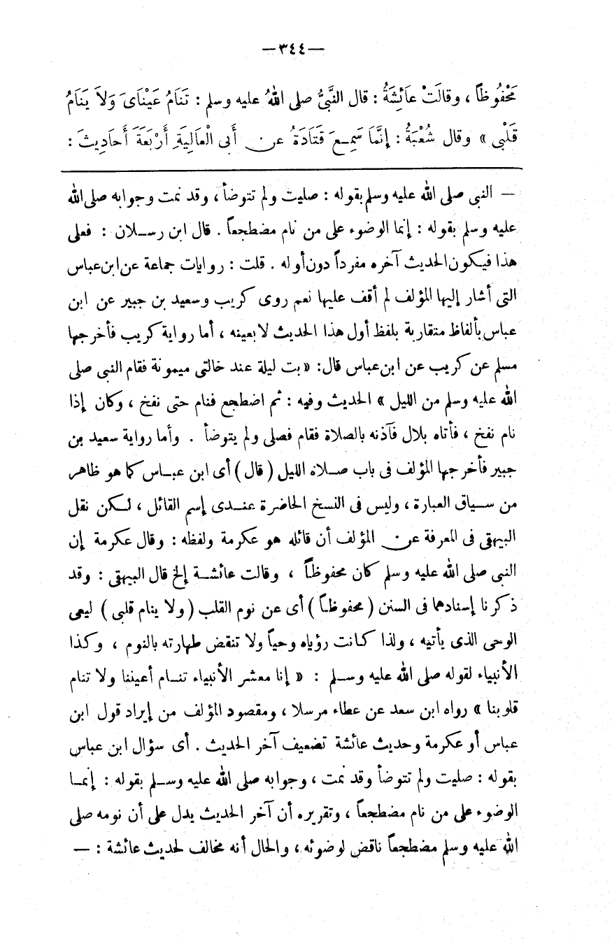 : لِيَعِيَ الْوَحْي الَّذِي يَأْتِيه ، وَلِذَا كَانَتْ رُؤْيَاهُ وَحْيًا وَلَا تُنْقَض طَهَارَته بِالنَّوْمِ ، وَكَذَا الْأَنْبِيَاء لِقَوْلِهِ صَلَّى اللَّه عَلَيْهِ وَسَلَّمَ : " إِنَّا مَعْشَر الْأَنْبِيَاء تَنَام أَعْيُننَا وَلَا تَنَام قُلُوبنَا " رَوَاهُ اِبْن سَعْد عَنْ عَطَاء مُرْسَلًا ، وَمَقْصُود الْمُؤَلِّف مِنْ إِيرَاد قَوْل اِبْن عَبَّاس أَوْ عِكْرِمَة وَحَدِيث عَائِشَة تَضْعِيف آخِر الْحَدِيث . أَيْ سُؤَال اِبْن عَبَّاس بِقَوْلِهِ : صَلَّيْت وَلَمْ تَتَوَضَّأ وَقَدْ نِمْت ، وَجَوَابه صَلَّى اللَّه عَلَيْهِ وَسَلَّمَ بِقَوْلِهِ : إِنَّمَا الْوُضُوء عَلَى مَنْ نَامَ مُضْطَجِعًا ، وَتَقْرِيره أَنَّ آخِر الْحَدِيث يَدُلّ عَلَى أَنَّ نَوْمه صَلَّى اللَّه عَلَيْهِ وَسَلَّمَ مُضْطَجِعًا ، نَاقِض لِوُضُوئِهِ ، وَالْحَال أَنَّهُ مُخَالِف لِحَدِيثِ عَائِشَة :@