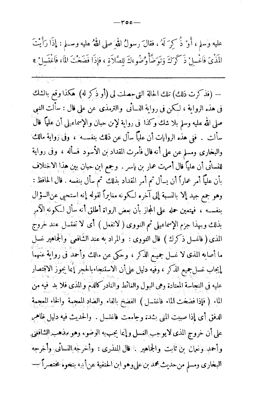 : هَكَذَا وَقَعَ بِالشَّكِّ فِي هَذِهِ الرِّوَايَة ، لَكِنْ فِي رِوَايَة النَّسَائِيِّ وَالتِّرْمِذِيّ عَنْ عَلِيّ قَالَ : سَأَلْت النَّبِيّ صَلَّى اللَّه عَلَيْهِ وَسَلَّمَ بِلَا شَكّ وَكَذَا فِي رِوَايَة لِابْنِ حِبَّان الْإِسْمَاعِيلِيّ أَنَّ عَلِيًّا قَالَ سَأَلْت . فَفِي هَذِهِ الرِّوَايَات أَنَّ عَلِيًّا سَأَلَ عَنْ ذَلِكَ بِنَفْسِهِ ، وَفِي رِوَايَة مَالِك وَالْبُخَارِيّ وَمُسْلِم عَنْ عَلِيّ أَنَّهُ قَالَ فَأَمَرْت الْمِقْدَاد بْن الْأَسْوَد فَسَأَلَهُ ، وَفِي رِوَايَة لِلنَّسَائِيِّ أَنَّ عَلِيًّا قَالَ أَمَرْت عَمَّار بْن يَاسِر . وَجَمَعَ اِبْن حِبَّان بَيْن هَذَا الِاخْتِلَاف بِأَنَّ عَلِيًّا أَمَرَ عَمَّارًا أَنْ يَسْأَل ثُمَّ أَمَرَ الْمِقْدَاد بِذَلِكَ ثُمَّ سَأَلَ بِنَفْسِهِ . قَالَ الْحَافِظ : وَهُوَ جَمْع جَيِّد إِلَّا بِالنِّسْبَةِ إِلَى آخِره لِكَوْنِهِ مُغَايِرًا لِقَوْلِهِ إِنَّهُ اِسْتَحَى عَنْ السُّؤَال بِنَفْسِهِ ، فَيَتَعَيَّن حَمْله عَلَى الْمَجَاز بِأَنَّ بَعْض الرُّوَاة أَطْلَقَ أَنَّهُ سَأَلَ لِكَوْنِهِ الْآمِر بِذَلِكَ وَبِهَذَا جَزَمَ الْإِسْمَاعِيلِيّ ثُمَّ النَّوَوِيّ " لَا تَفْعَل " : أَيْ لَا تَغْتَسِل عِنْد خُرُوج الْمَذْي