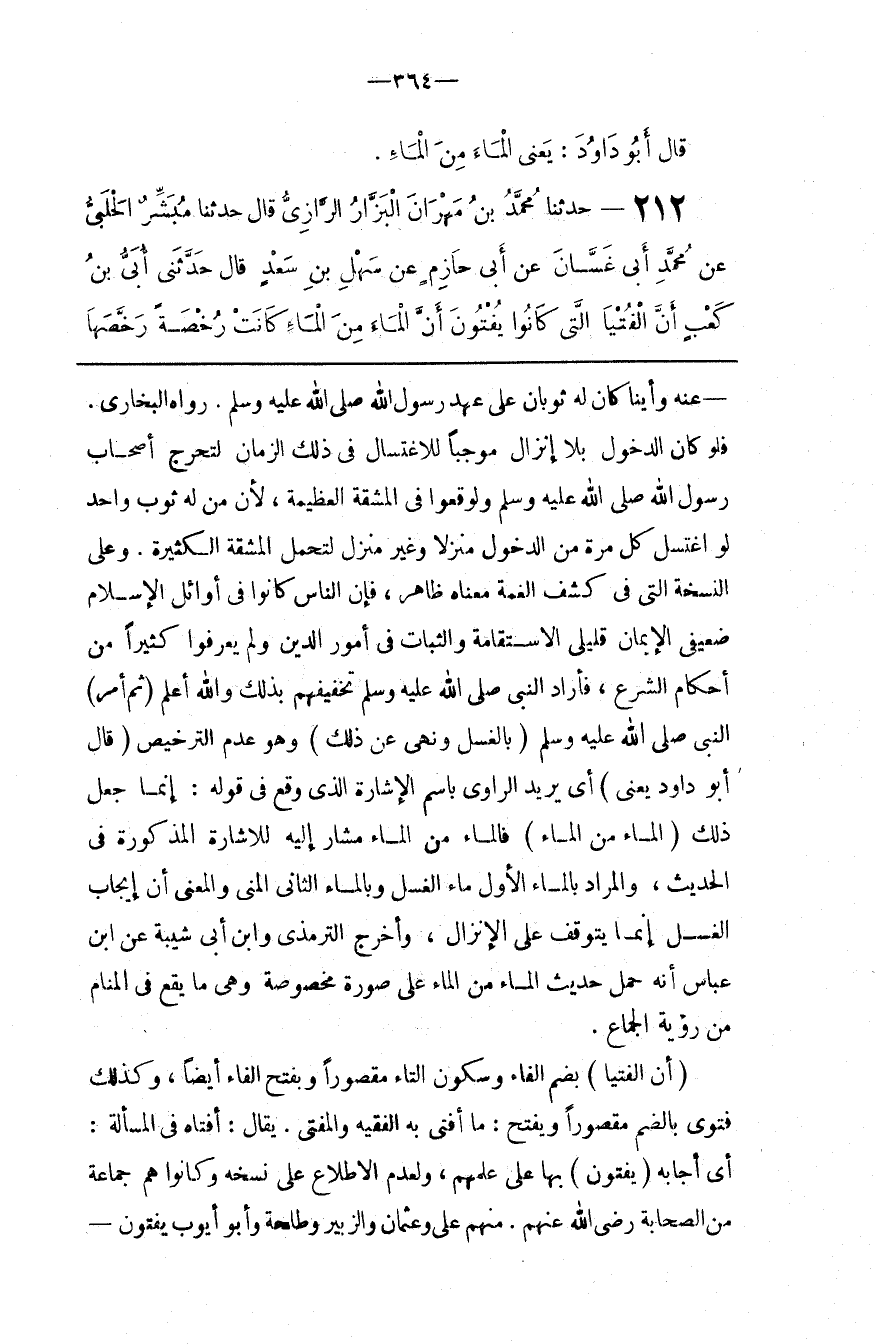 عَنْهُ وَأَيّنَا كَانَ لَهُ ثَوْبَانِ عَلَى عَهْد رَسُول اللَّه صَلَّى اللَّه عَلَيْهِ وَسَلَّمَ . رَوَاهُ الْبُخَارِيّ . فَلَوْ كَانَ الدُّخُول بِلَا إِنْزَال مُوجِبًا لِلِاغْتِسَالِ فِي ذَلِكَ الزَّمَان لَتَحَرَّجَ أَصْحَاب رَسُول اللَّه صَلَّى اللَّه عَلَيْهِ وَسَلَّمَ وَلَوَقَعُوا فِي الْمَشَقَّة الْعَظِيمَة ، لِأَنَّ مَنْ لَهُ ثَوْب وَاحِد لَوْ اِغْتَسَلَ كُلّ مَرَّة مِنْ الدُّخُول مُنْزِلًا وَغَيْر مُنْزِل لَتَحَمَّلَ الْمَشَقَّة الْكَثِيرَة . وَعَلَى النُّسْخَة الَّتِي فِي كَشْف الْغُمَّة مَعْنَاهُ ظَاهِر ، فَإِنَّ النَّاس كَانُوا فِي أَوَائِل الْإِسْلَام ضَعِيفِي الْإِيمَان قَلِيلِي الِاسْتِقَامَة وَالثَّبَات فِي أُمُور الدِّين وَلَمْ يَعْرِفُوا كَثِيرًا مِنْ أَحْكَام الشَّرْع ، فَأَرَادَ النَّبِيّ صَلَّى اللَّه عَلَيْهِ وَسَلَّمَ تَخْفِيفهمْ بِذَلِكَ وَاَللَّه أَعْلَم