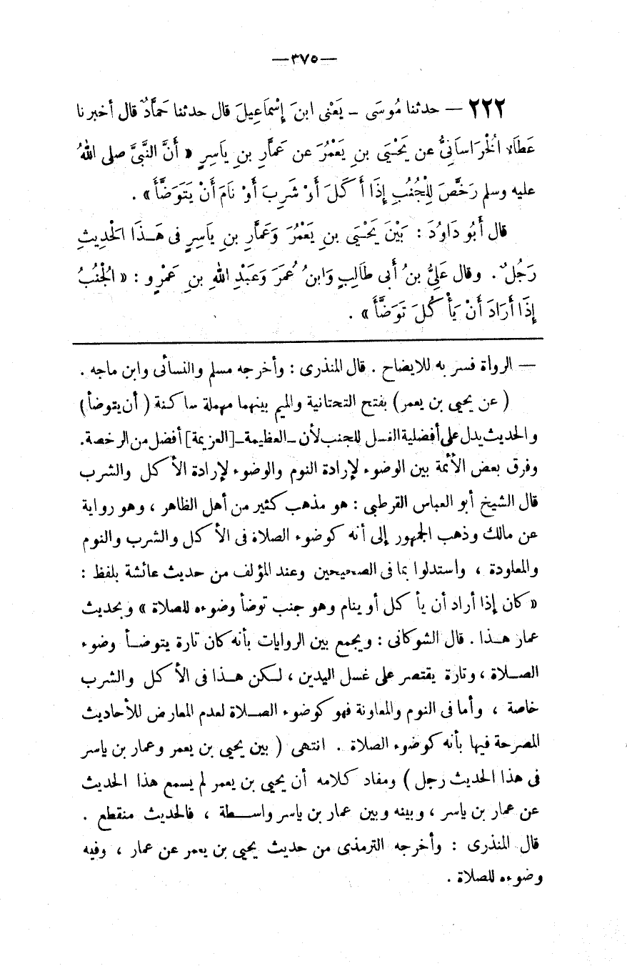 : وَمُفَاد كَلَامه أَنَّ يَحْيَى بْن يَعْمَر لَمْ يَسْمَع هَذَا الْحَدِيث عَنْ عَمَّار بْن يَاسِر ، وَبَيْنه وَبَيْن عَمَّار بْن يَاسِر وَاسِطَة ، فَالْحَدِيث مُنْقَطِع . قَالَ الْمُنْذِرِيُّ : وَأَخْرَجَهُ التِّرْمِذِيّ مِنْ حَدِيث يَحْيَى بْن يَعْمَر عَنْ عَمَّار ، وَفِيهِ وُضُوءَهُ لِلصَّلَاةِ .@