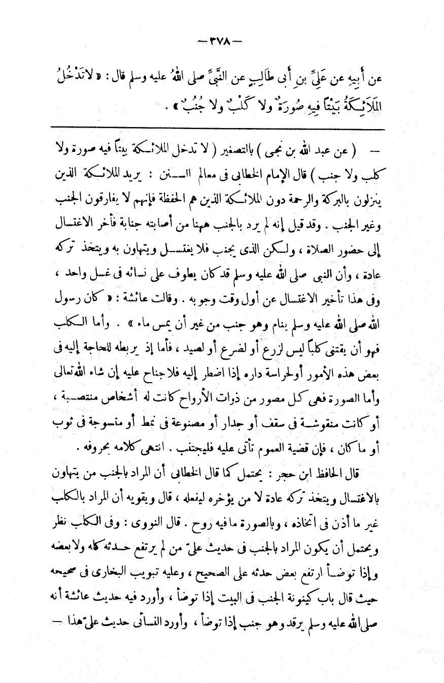قَالَ الْحَافِظ اِبْن حَجَر : يَحْتَمِل كَمَا قَالَ الْخَطَّابِيُّ أَنَّ الْمُرَاد بِالْجُنُبِ مَنْ يَتَهَاوَن بِالِاغْتِسَالِ وَيَتَّخِذ تَرْكه عَادَة لَا مَنْ يُؤَخِّرهُ لِيَفْعَلهُ ، قَالَ وَيُقَوِّيه أَنَّ الْمُرَاد بِالْكَلْبِ غَيْر مَا أُذِنَ فِي اِتِّخَاذه ، وَبِالصُّورَةِ مَا فِيهِ رُوح . قَالَ النَّوَوِيّ : وَفِي الْكَلْب نَظَر وَيَحْتَمِل أَنْ يَكُون الْمُرَاد بِالْجُنُبِ فِي حَدِيث عَلِيّ مَنْ لَمْ يَرْتَفِع حَدَثه كُلّه وَلَا بَعْضه وَإِذَا تَوَضَّأَ اِرْتَفَعَ بَعْض حَدَثه عَلَى الصَّحِيح ، وَعَلَيْهِ تَبْوِيب الْبُخَارِيّ فِي صَحِيحه حَيْثُ قَالَ بَاب كَيْنُونَة الْجُنُب فِي الْبَيْت إِذَا تَوَضَّأَ ، وَأَوْرَدَ فِيهِ حَدِيث عَائِشَة أَنَّهُ صَلَّى اللَّه عَلَيْهِ وَسَلَّمَ يَرْقُد وَهُوَ جُنُب إِذَا تَوَضَّأَ ، وَأَوْرَدَ النَّسَائِيُّ حَدِيث عَلِيّ هَذَا @