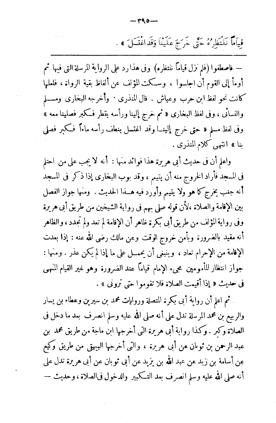 : وَفِي هَذَا رَدّ عَلَى الرِّوَايَة الْمُرْسَلَة الَّتِي فِيهَا ثُمَّ أَوْمَأَ إِلَى الْقَوْم أَنْ اِجْلِسُوا ، وَسَكَتَ الْمُؤَلِّف عَنْ أَلْفَاظ بَقِيَّة الرُّوَاة ، فَلَعَلَّهَا كَانَتْ نَحْو لَفْظ اِبْن حَرْب وَعَيَّاش . قَالَ الْمُنْذِرِيُّ . وَأَخْرَجَهُ الْبُخَارِيّ وَمُسْلِم وَالنَّسَائِيُّ ، وَفِي لَفْظ الْبُخَارِيّ " ثُمَّ خَرَجَ إِلَيْنَا وَرَأْسه يَقْطُر فَكَبَّرَ فَصَلَّيْنَا مَعَهُ " وَفِي لَفْظ مُسْلِم " حَتَّى خَرَجَ إِلَيْنَا وَقَدْ اِغْتَسَلَ يَنْطِف رَأْسه مَاء فَكَبَّرَ فَصَلَّى بِنَا " اِنْتَهَى كَلَام الْمُنْذِرِيِّ .
