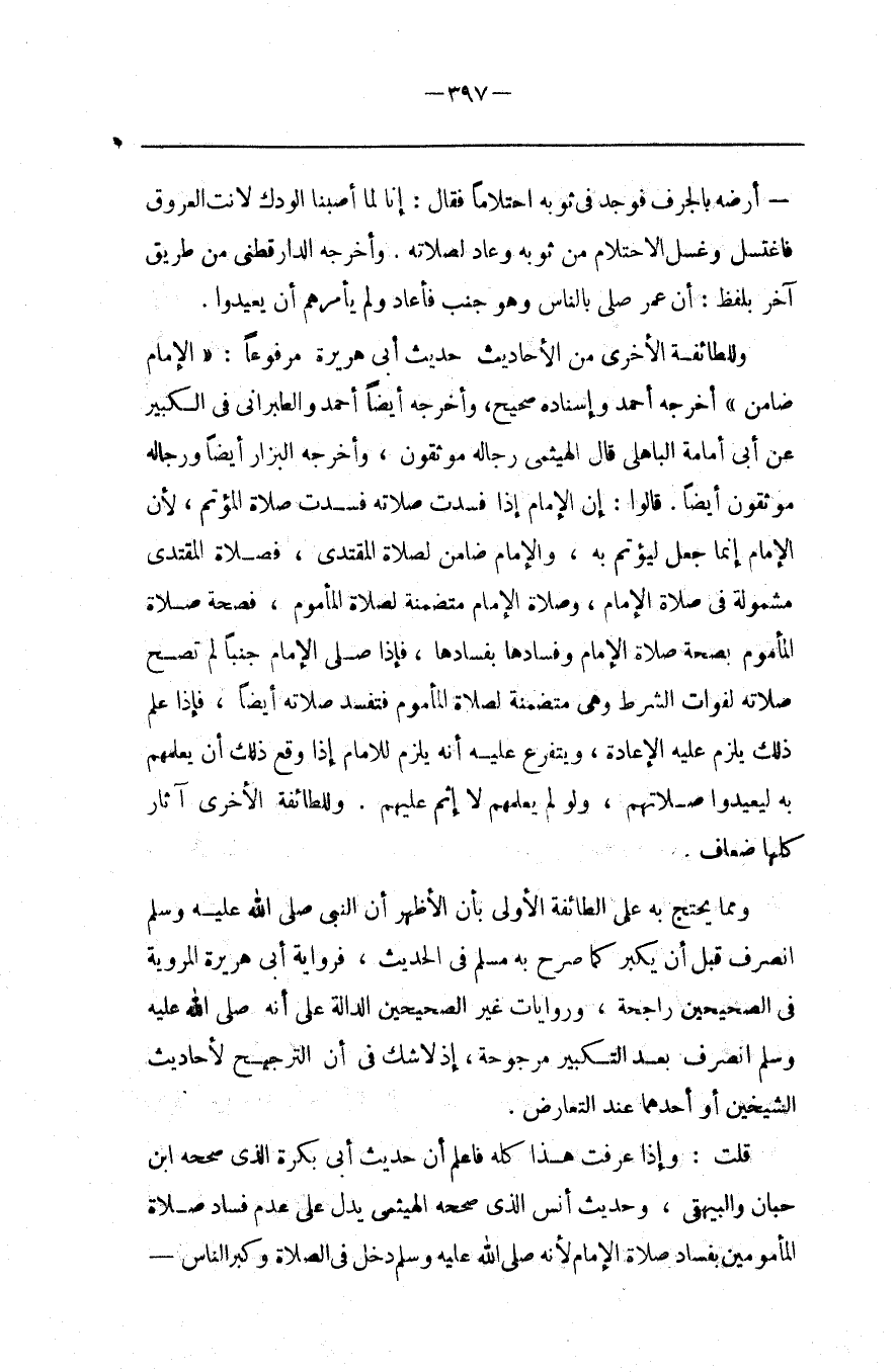 وَمِمَّا يُحْتَجّ بِهِ عَلَى الطَّائِفَة الْأُولَى بِأَنَّ الْأَظْهَر أَنَّ النَّبِيّ صَلَّى اللَّه عَلَيْهِ وَسَلَّمَ اِنْصَرَفَ قَبْل أَنْ يُكَبِّر كَمَا صَرَّحَ بِهِ مُسْلِم فِي الْحَدِيث ، فَرِوَايَة أَبِي هُرَيْرَة الْمَرْوِيَّة فِي الصَّحِيحَيْنِ رَاجِحَة ، وَرِوَايَات غَيْر الصَّحِيحَيْنِ الدَّالَّة عَلَى أَنَّهُ صَلَّى اللَّه عَلَيْهِ وَسَلَّمَ اِنْصَرَفَ بَعْد التَّكْبِير مَرْجُوحَة ، إِذْ لَا شَكّ فِي أَنَّ التَّرْجِيح لِأَحَادِيث الشَّيْخَيْنِ أَوْ أَحَدهمَا عِنْد التَّعَارُض . قُلْت : وَإِذَا عَرَفْت هَذَا كُلّه فَاعْلَمْ أَنَّ حَدِيث أَبِي بَكْرَة الَّذِي صَحَّحَهُ اِبْن حِبَّان وَالْبَيْهَقِيُّ ، وَحَدِيث أَنَس الَّذِي صَحَّحَهُ الْهَيْثَمِيّ يَدُلّ عَلَى عَدَم فَسَاد صَلَاة الْمَأْمُومِينَ بِفَسَادِ صَلَاة الْإِمَام لِأَنَّهُ صَلَّى اللَّه عَلَيْهِ وَسَلَّمَ دَخَلَ فِي الصَّلَاة وَكَبَّرَ النَّاس@